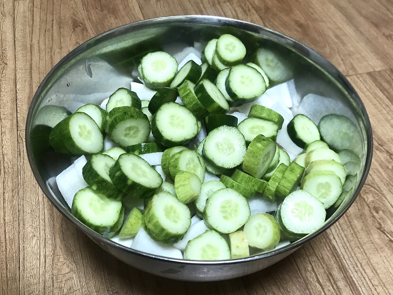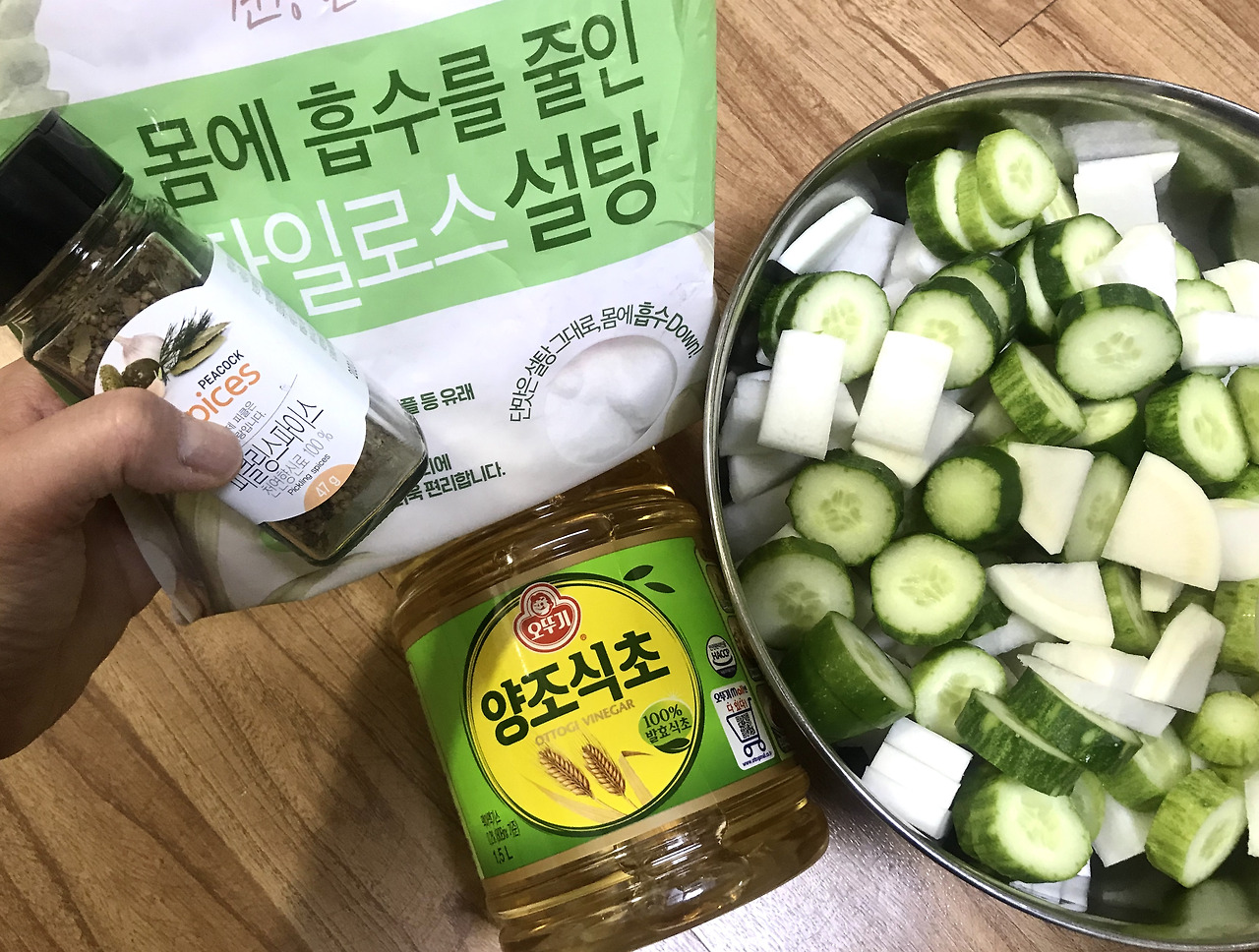 그런데 오늘 난 오이가 듬뿍 들어간 피클을 담갔다. 무와 오이를 한입 크기로 또각또각 잔뜩 썰어 속이 깊은 큰 스텐레스 그릇에 넣은 후 식초와 자일로스 설탕, 물, 그리고 피클링 스파이스를 넣고 끓인 물을 부어 만들었다.