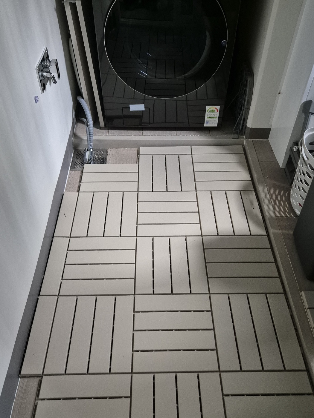 원래는 세탁실에 슬리퍼를 신고 다녔는데 점점 귀찮아졌다. 그래서 남편과 이케아에서 발판을 사 와 간단하게 조립하여 세탁실 바닥에 깔아놨는데 굉장히 편하다.