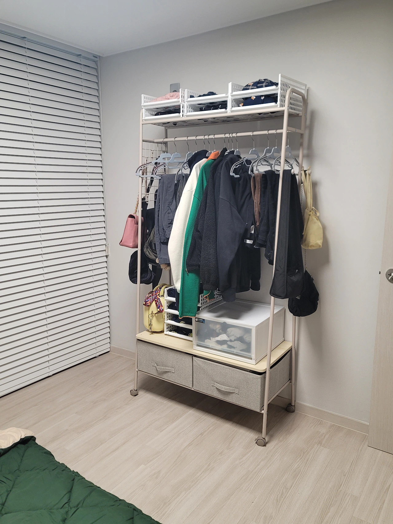 원래 옷장을 사려다가 작은방에 붙박이장이 하나 있길래 거기에 잘 입지 않는 옷들을 넣기로 결정하고 구매한 작은 행거.