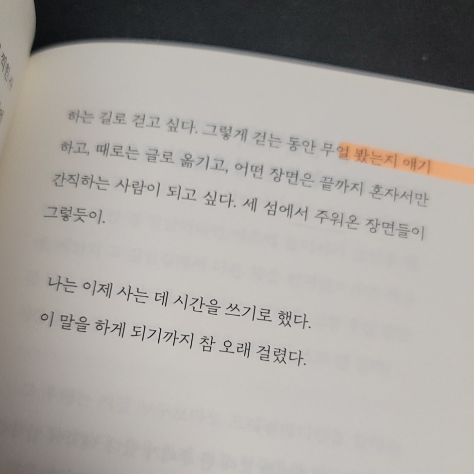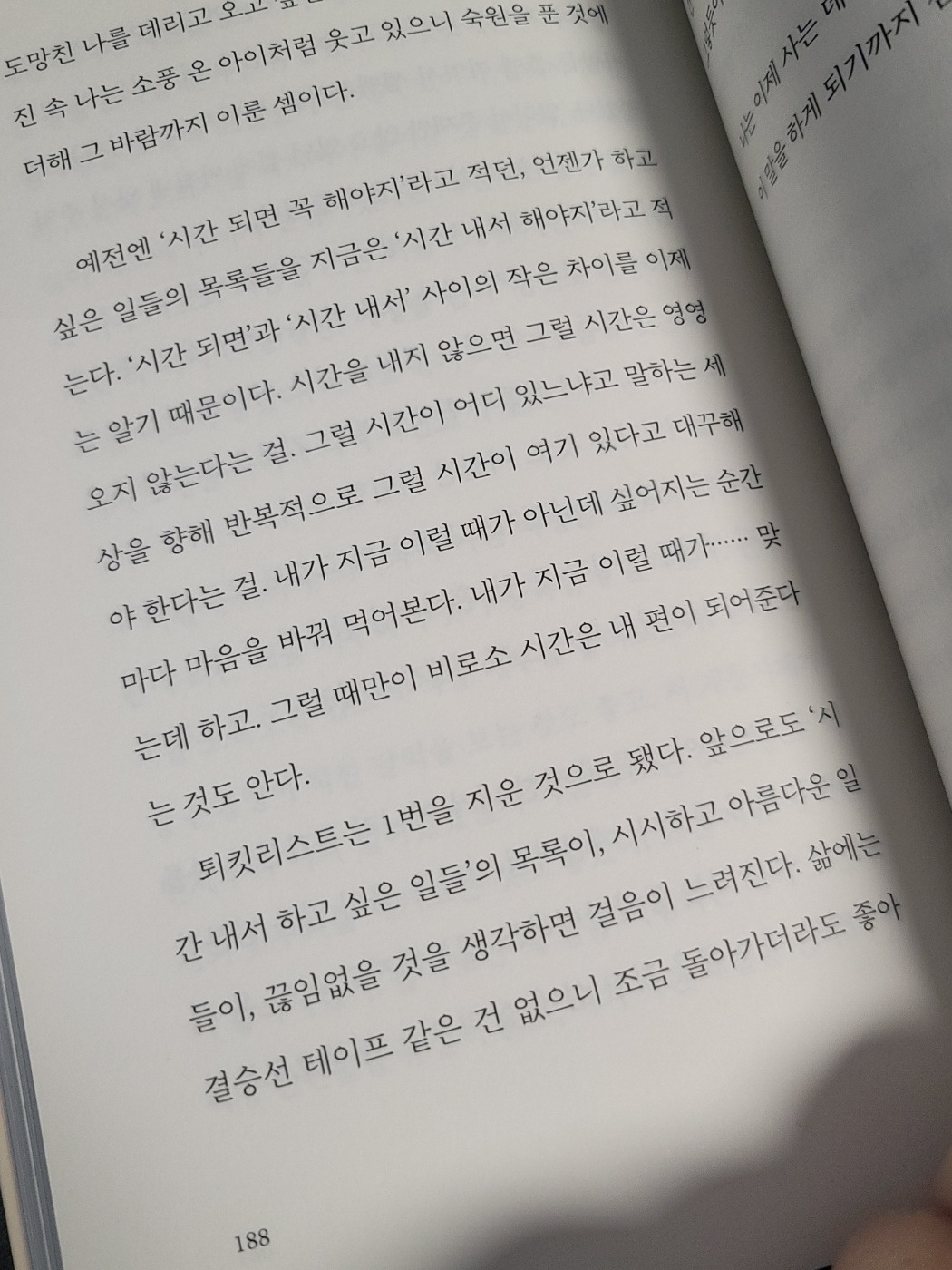 예전엔 '시간 되면 꼭 해야지'라고 적던, 언젠가 하고 싶은 일들의 목록들을 지금은 '시간 내서 해야지'라고 적는다. '시간 되면'과 '시간 내서' 사이의 작은 차이를 이제는 알기 때문이다. 시간을 내지 않으면 그럴 시간은 영영 오지 않는다는 걸.
