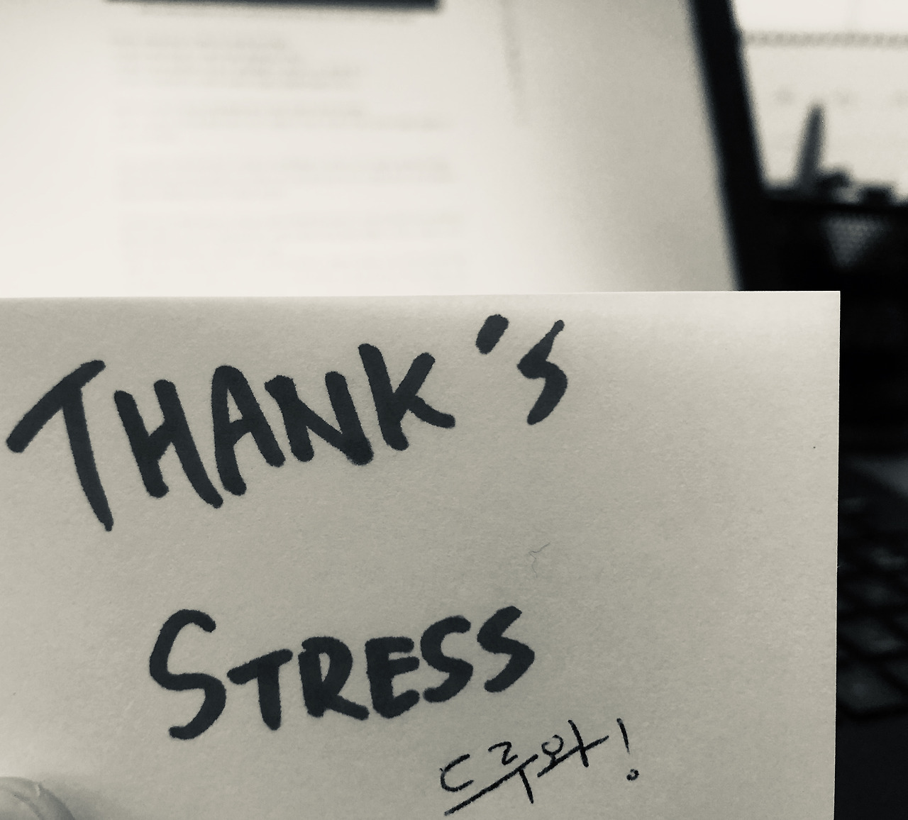 나 또한 2019년을 표현하자면 '다사다난'의 한 해였다. 직원들과 파트너들과의 관계, 매출과 실적의 문제, 투자자들과의 이해관계 충돌, 새로운 오피스 이사로 인해 들어가는 정신적 에너지 등 굉장히 긴장되고 힘든 시기가 많았다. 무척 고맙게도 이런 사실을 모른 체 살았다면 고통의 연속이었을 것이다. 하지만 창가나 책상 등에 작은 포스트잇이나 메모 하나를 적어두고 스트레스에게 고맙다고 말하기 시작하니 정말 놀라운 효과가 일어났다.