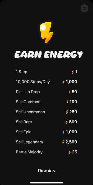 - 이 게임의 돈은 Energy이다. 한 걸음당 1 에너지를 준다. 만보를 채우면 보너스 1000 에너지를 준다.