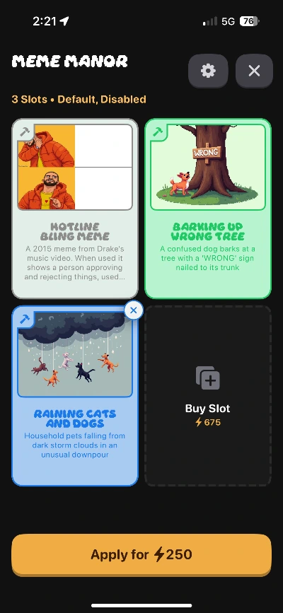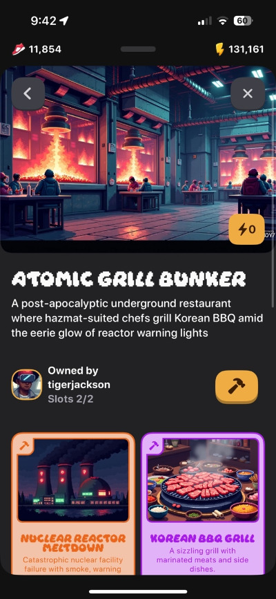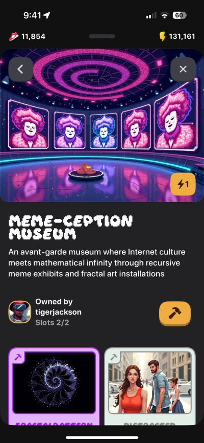 - 구매한 땅에 건물을 지으려면 드롭에서 얻은 아이템들 2-3가지를 넣어서 조합을 한다. 여기서 재미있는 것은 이 아이템들이 건축이나 건물과 전혀 상관없는 생뚱맞은 것들이라는 것이다.