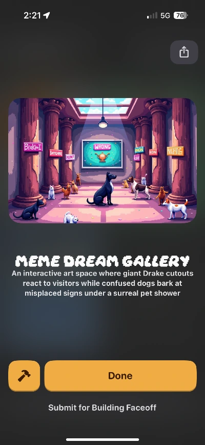- AI를 이용하여 건물을 만든다는 것. AI를 이용하여 그림을 그리는 것과 비슷한데, 말도 안 되는 아이템들의 조합으로 건물을 순식간에 만들 수 있다는 것은 신선하고 재미있다.