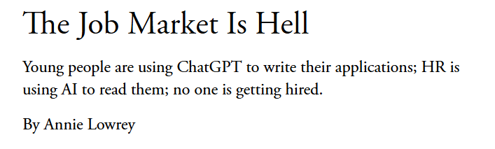 "젊은이들은 ChatGPT를 사용해서 회사 지원서를 쓰고, 회사 인사팀은 Ai를 사용해서 회사 지원서를 보고, 아무도 고용이 되지 않는다."