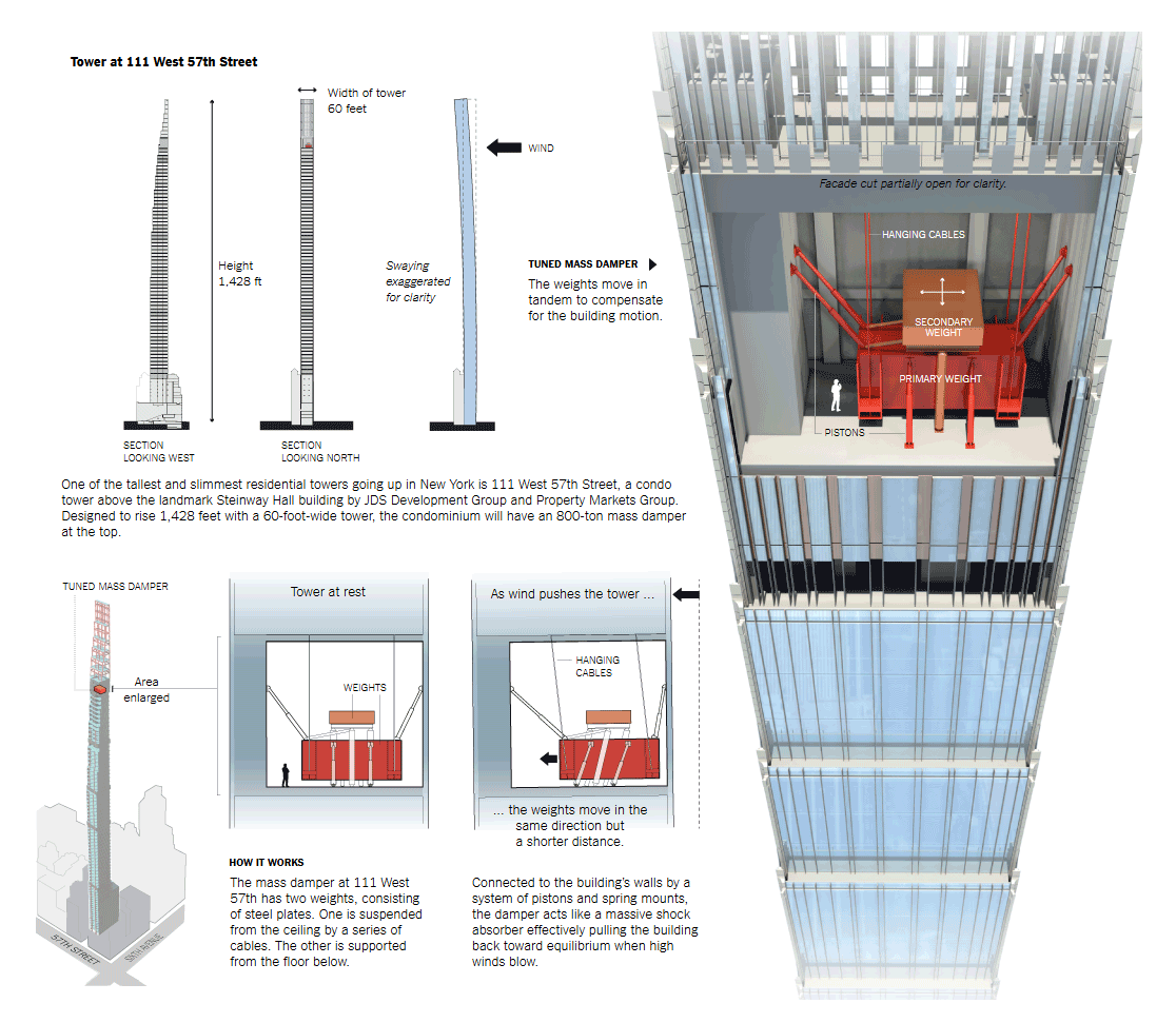모든 고층 빌딩은 바람에 흔들리지만, 초고층의 날씬한 타워는 더 많이 움직인다. 432 파크의 설계자들은 건물이 약 1미터 이상 흔들릴 것으로 예상했는데, 이는 욕조의 물이 넘치고 샹들리에가 딸랑거릴 정도다.