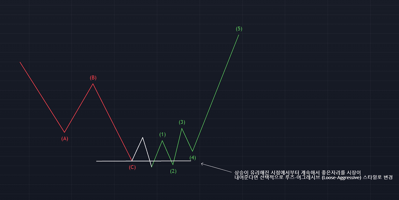 그러다 정말 어느 날 대운이 찾아왔고 1억이라는 돈을 손에 쥐게 되었을 때, 무의식 중으로 루즈형 스타일로는 큰돈을 못 벌 것이라는 불안한 확신이 들었고, 트레이딩 스타일을 완전히 바꾸기 시작한다. 그렇게 점차 변한 게 '타이트-어그레시브 (Tight-Aggressive)에 치우쳐진 어그레시브 성향'