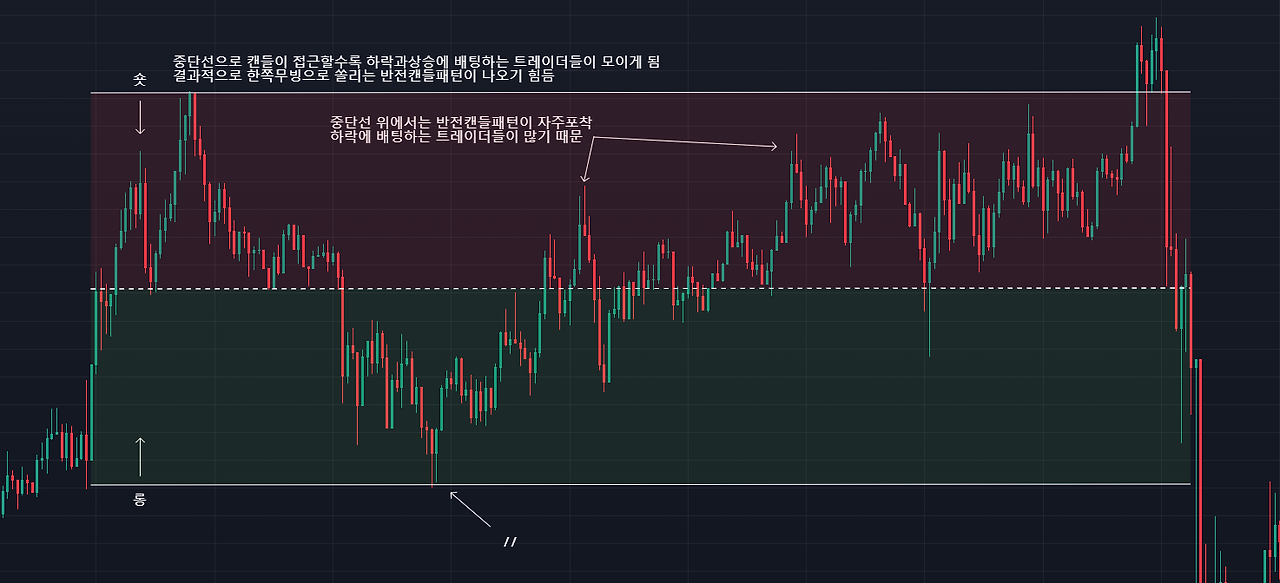 박스권으로 따졌을 때, 중단선에서 일어나는 장악형 캔들, 해머캔들을 찾는 것과 같다고 보면 된다. 실제로 횡보구간중단선은 수많은 손바뀜이 일어나면서 롱/숏이 유동성으로 줄달리기를 하는 구간이다. 그래서 장악형/해머캔들보다는 단일적으로 캔들하나로 해석하는 모멘텀캔들패턴이 횡보구간에서 좋은 결과를 도출해 줄 가능성이 높다.
