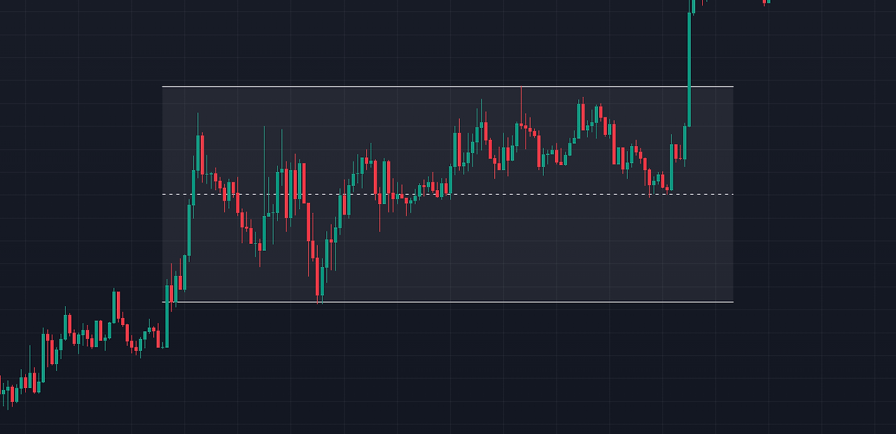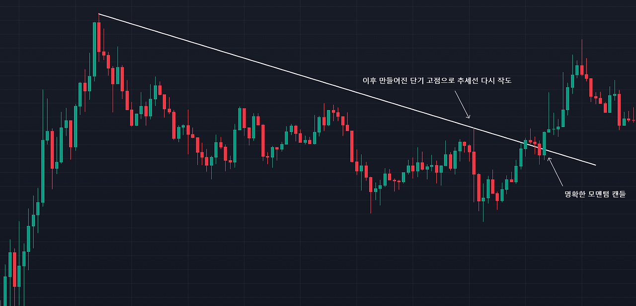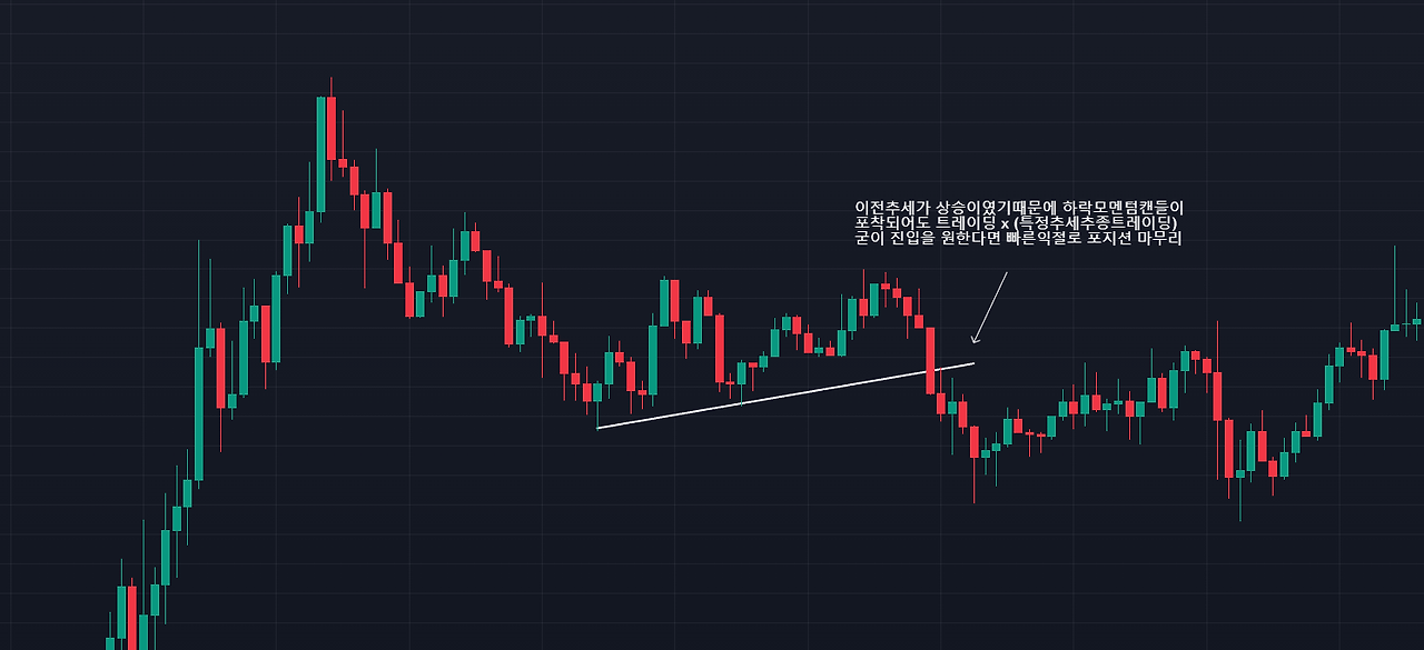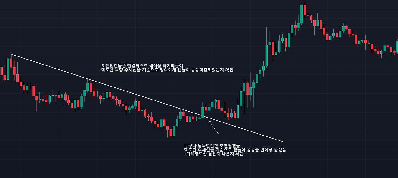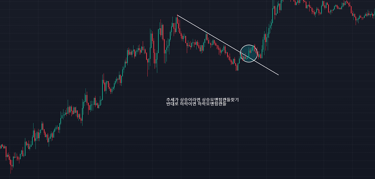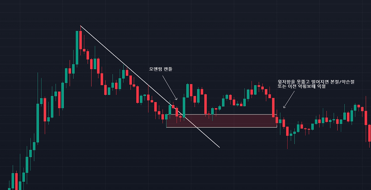 명확한 추세반전(변곡)이 일어났다는 것을 판단한 뒤, 특정한 매물대/횡보/수렴/웻지/박스권상에서 캔들돌파(모멘텀 캔들)를 식별 후, 진입을 하는 데 사용하기 적합한 것이 모멘텀 캔들이다.