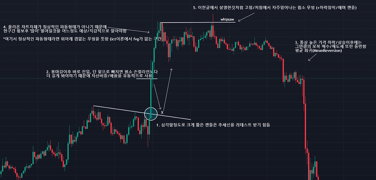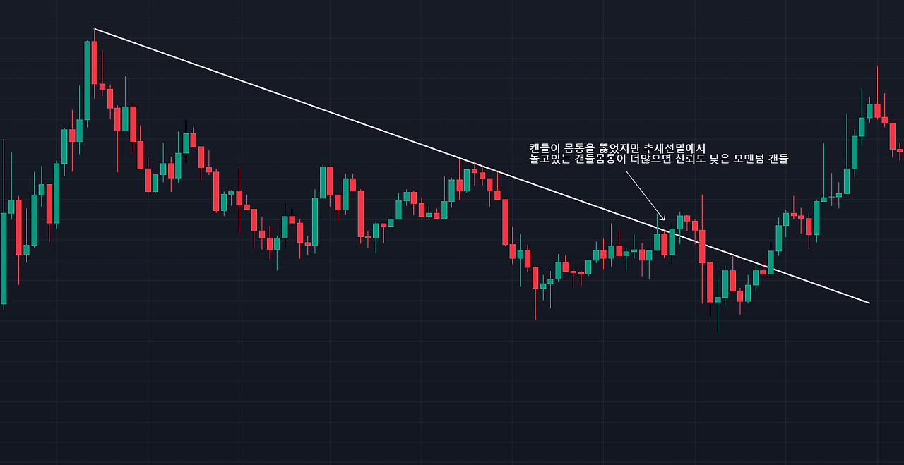 고타임프레임에서 변곡을 찾고 저 타임프레임에서 추세를 추종하는 트레이딩을 한다는 것이 독자분들이 느끼기에 단어선택/해석차이에 따라 반전되어 느껴질 수 있음을 이해한다. 그저 '캔들'로만 차트를 해석했을 때 이해를 돕기 위한 설명일 뿐이니, 너무 큰 의미부여를 하지 않았으면 한다. 왜 그러하냐? 하면 모멘텀캔들자체가 상당히 의미 있는 변곡점에서는 잘 나오지 않고, 해석하기에 애로사항이 많은 캔들패턴이기 때문이다.
