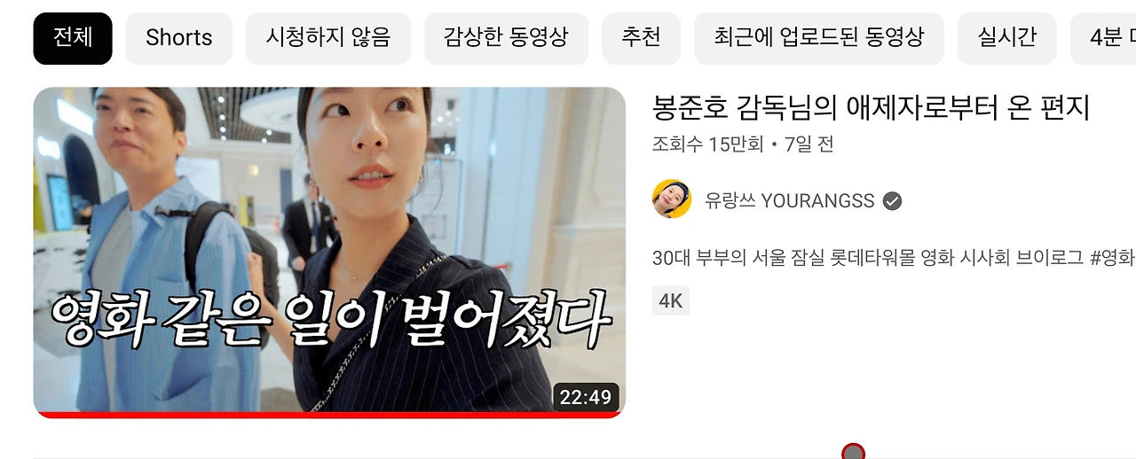 바로 이 썸네일이었습니다. 저는 '유랑쓰'라는 채널을 이날 처음 보게 됐습니다. 아마도 '봉준호'라는 태그가 저를 걸었나 봅니다. 제목에 봉준호 감독의 애제자라는 말이 자극적이었습니다. 음.. 저에는 꽤나 공격적인 단어입니다. 한국 영화가 도제시스템의 허물을 벗어난 지 좀 됐다고 생각했는데 애제자라니.. 그것도 봉준호 감독의? 저는 제목의 도발에 제대로 낚였고 그 애제자라는 놈이 누구냐 하는 마음으로 영상을 보았습니다.