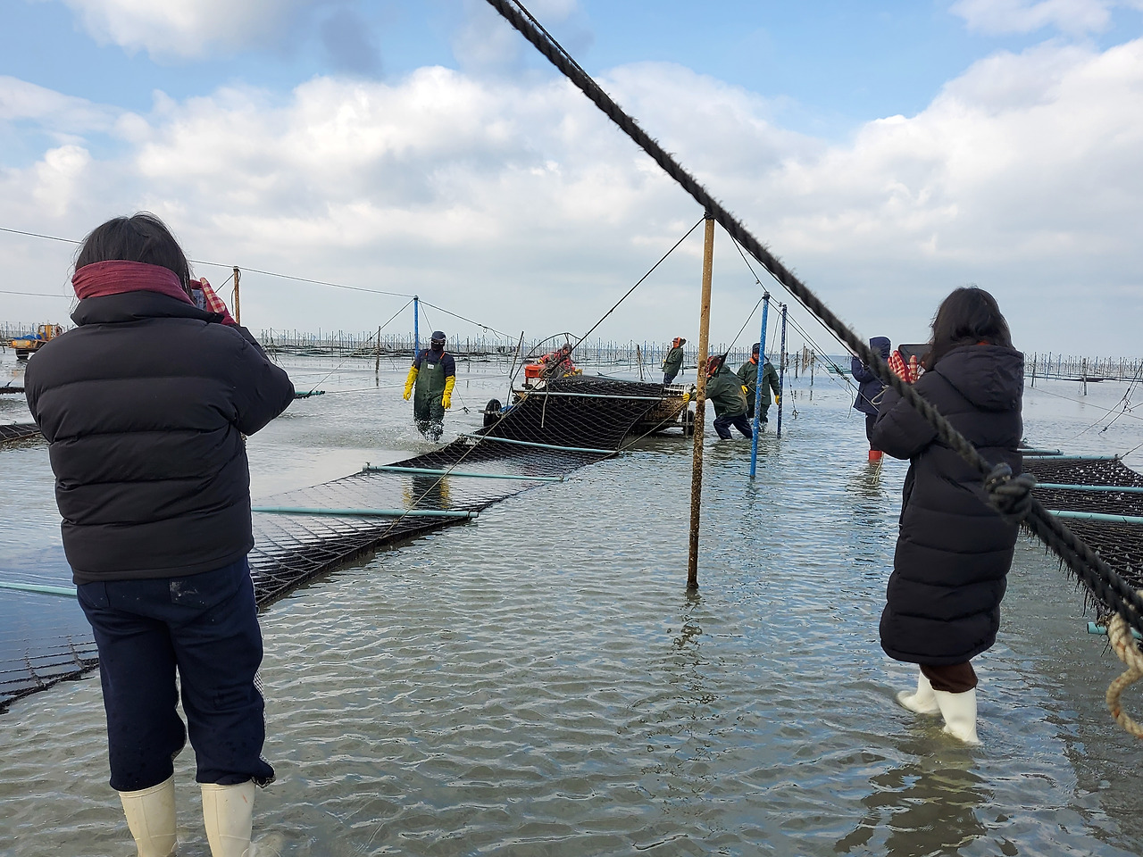 대부분의 조업은 배 위에서 작업하지만 섬진강 재첩잡이와 김 조업은 물길을 걸으며 작업한다. 답사 때두꺼운 양말에 핫팩을 붙이고 장화를 신었지만... 소용없는 일이었다. 차디찬 겨울바다 속에서 발가락이 사라진 것처럼 감각이 느껴지지 않았다. 동상에 걸릴까 봐 발을 계속 움직이고 물길을 걷는 일도 피로했다. 실제로 작업하는 과정을 다 지켜보다 보니 시간이 오래 지체됐고 다른 답사 일정도 있어서 작가들만 먼저 바닷길을 나가겠다고 했다. 육지사람들의 무모한 도전이었다.