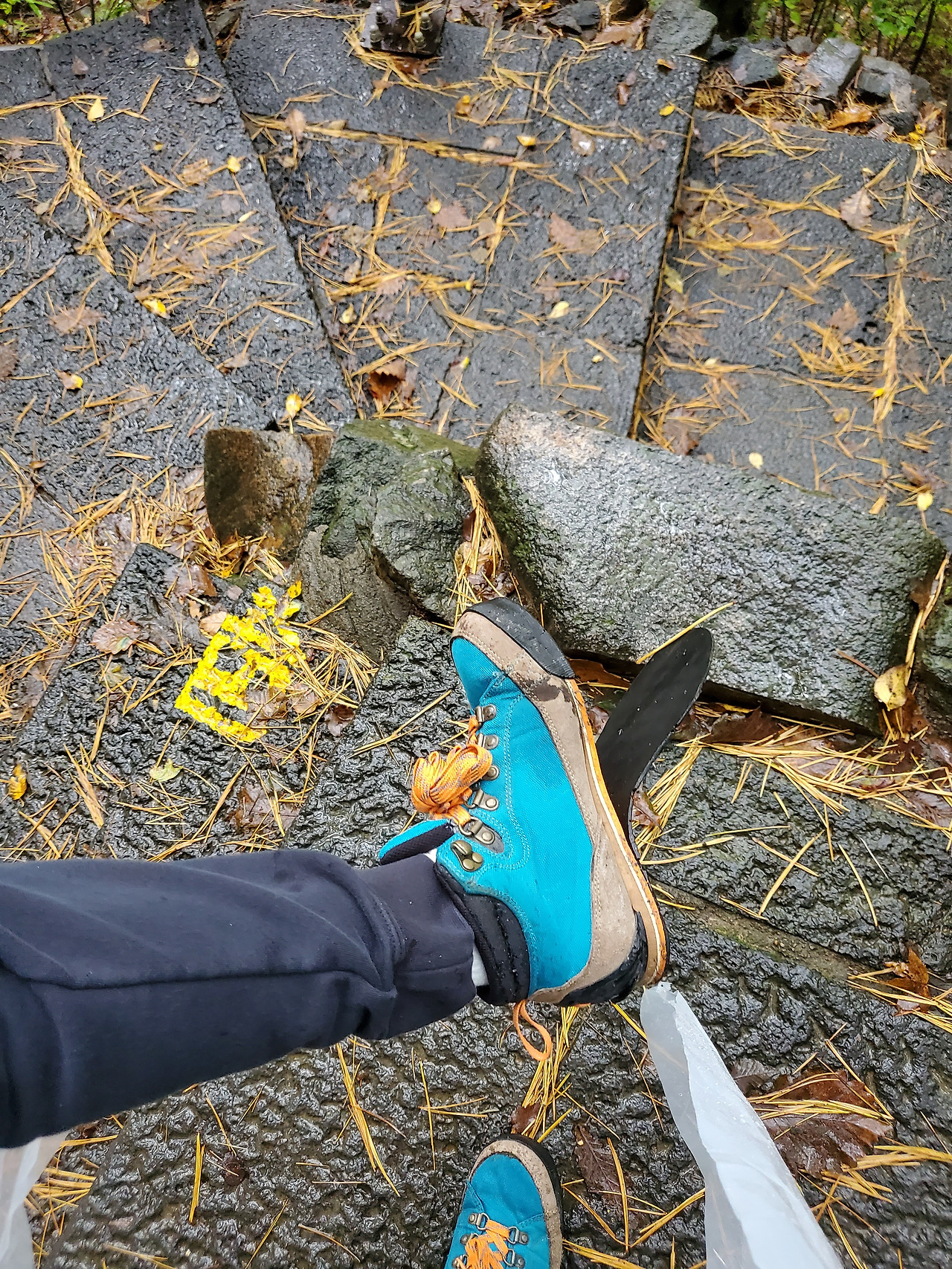 오대산 단풍을 보러 가던 길, 500 계단을 다 채우지도 못했는데 등산화 밑바닥이 떨어져 버렸다. 오래 신기도 했지만 그날 비가 와서 버티기 힘들었나 보다.
