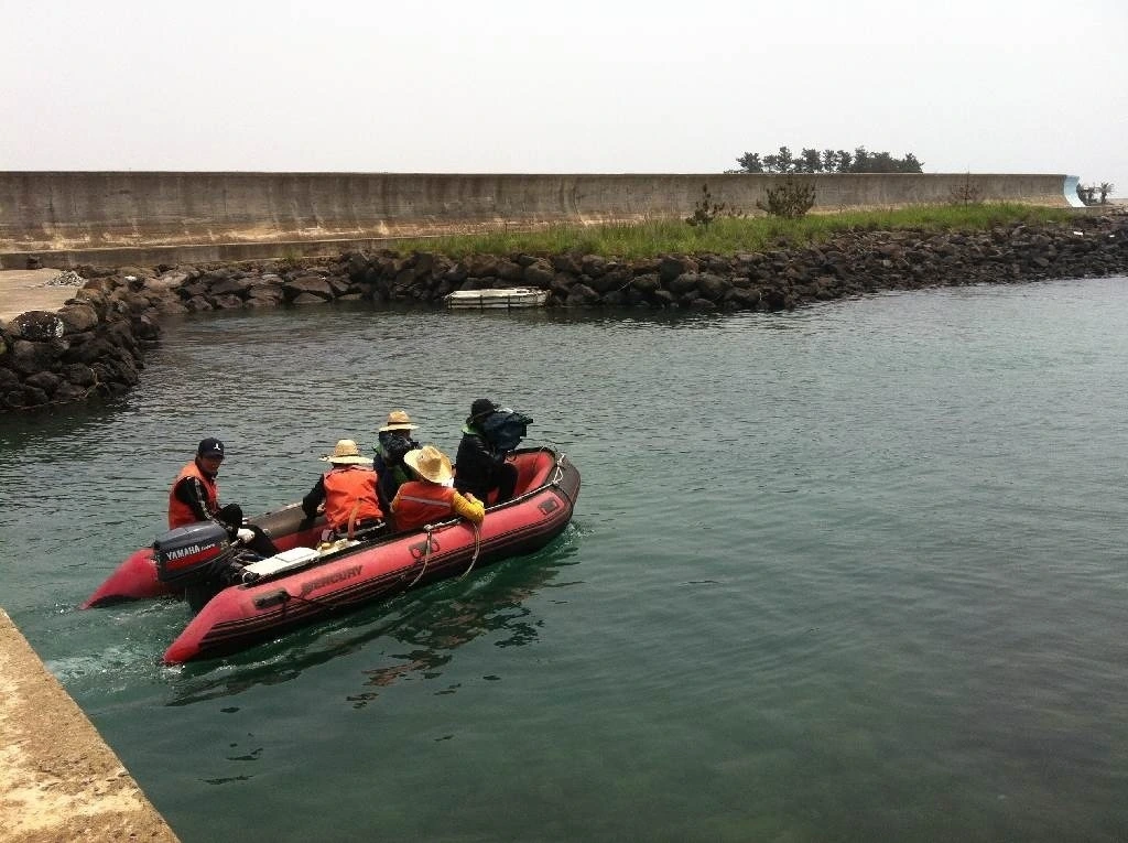 남방큰돌고래는 인간과 친화력이 가장 뛰어난 돌고래로 연안에서 1-2km 떨어진 곳에 살고 있기 때문에 육지에서도 볼 수 있는 돌고래입니다. 기본적으로는 차를 타고 해안도로를 따라가면서 육상 조사를 하고, 해상 조사를 할 때는 고무보트를 타고 나갑니다. 일단 큰 배를 타고 나가면 돌고래 서식지에 교란을 줄 수도 있기 때문에.