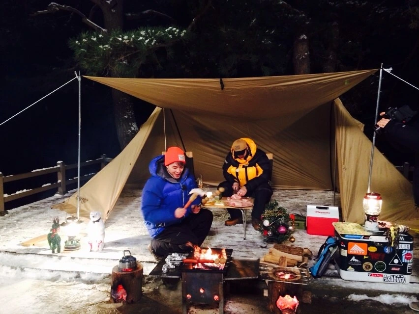 두 배우는 회장님집 마당에 텐트를 치고 늦은 저녁식사를 준비했다.