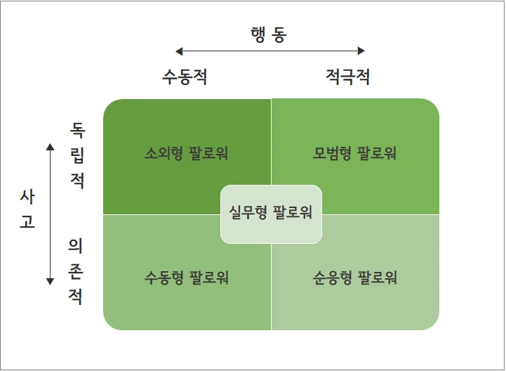 그림에 보시듯 총 다섯 개의 팔로워 유형이 있는데요. 이 중에서 모범형 팔로워가 가장 이상적인 모습입니다.