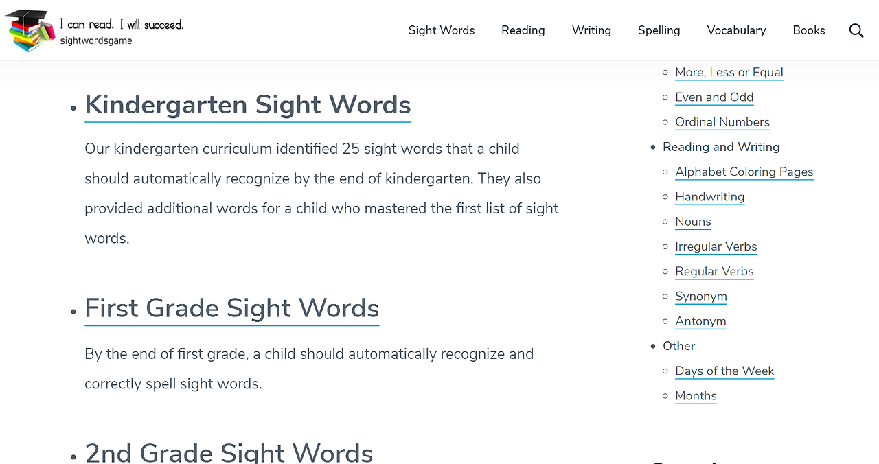 파닉스를 어느 정도 가르친 후엔 사이트 워드(Sight Words ∙ 빈번하게 나타나기 때문에 파닉스 규칙을 따지지 않고 통째로 외워서 눈으로 보자마자 읽을 수 있게 하는 단어)도 목록을 인쇄해서 읽는 연습을 시킨다. 그러면 파닉스는 거의 끝내는 셈이다. https://www.sightwordsgame.com/sight-words-list/ 에 가면 리스트가 있으니 참고하시길.
