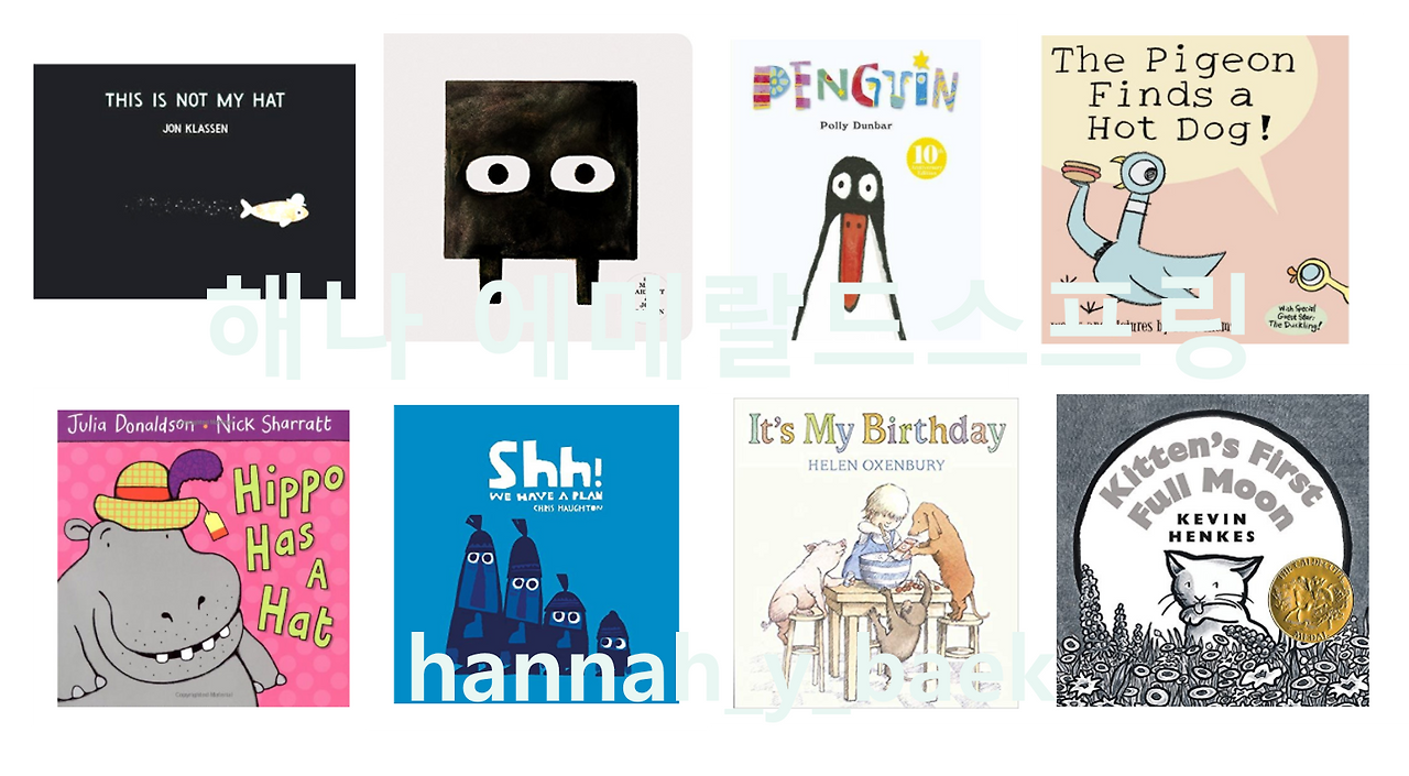 딸램과 나에게 모두 인기가 많았던 작가는 Jon Klassen, Mac Barnett, Polly Dunbar, Mo Willems, Julia Donaldson, Chris Haughton, Helen Oxenbury, Kevin Henkes, Babette Cole, Herve Tullet 등이 있다. Jon Klassen의 경우는 모자 시리즈와 도형 시리즈로 유명하고, Mac Barnett은 Jon Klassen과 도형 시리즈를 함께 작업한 사람이다. <Penguin>의 Polly Dunbar는 Tilly와 친구들 시리즈로, Mo Willems는 비둘기 시리즈로 유명하다. Gruffalo로 유명한 Julia Donaldson의 책 중에는 <Hippo has a hat> 같이 라임이 살아있고 초기에 읽어주기 좋은 책들이 꽤 있다. 색감도 원색에 가까워서 어린아이들에게 인기가 많다. Chris Haughton의 책은 주로 동물이 주인공인데, 그림체가 독특하고 색감이 예쁘며 반전이 있다. Helen Oxenbury의 책은 일단 수채화 느낌의 그림체가 정말 사랑스럽고 서정적인 책과 재미있는 책이 골고루 있다. Kevin Henkes의 책은 서정적인 그림체지만 Oxenbury 그림보다는 좀 더 유머스러운 느낌이 있고 이야기도 대반전까진 아니지만 소소한 즐거움이 있는 이야기들이다. Babette Cole은 신데 왕자 같이 고정관념을 깨는 재미있는 책을 썼다. 아이들에게 참여를 유도하는 Herve Tullet의 책은 정말 인기가 많은 책들이다. Tullet의 별명이 Prince of Preschooler이니 말 다했다ㅎㅎ