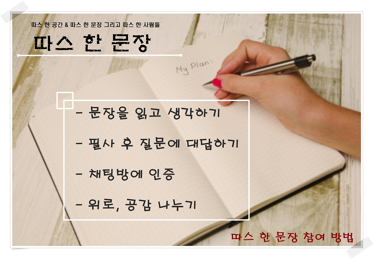 '따스 한 문장' 26기를 오픈합니다. 모임의 목적은 운영자가 매일 공개하는 문장을 따라 쓰는 것입니다. 손글씨, 캘리, 타이핑 무엇이든 상관없습니다. 어떤 방식으로든 인증하면 되죠. '필사할 문장'과 그 문장에 관련된 미션 질문이 평일 저녁 9시에 배달됩니다. 적정한 온도를 가진 문장을 필사하는 기쁨, 그 행복한 순간으로 당신을 초대합니다.