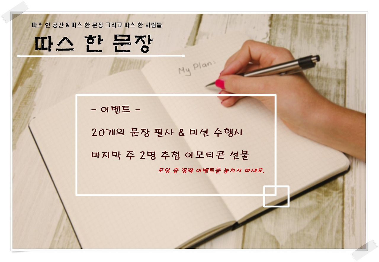 함께 필사하고 미션을 수행하며 대화를 나누는 따스방은 언제나 따뜻한 위로와 힐링이 넘쳐나는 공간입니다. 손글씨, 캘리, 타이핑 무엇이든 상관없습니다. 어떤 방식으로든 방에 인증하면 되죠. '필사할 문장'과 그 문장에 관련된 미션 질문이 평일 저녁 9시에 배달됩니다. 문장을 필사하는 기쁨, 따스함이 있는 공간으로 당신을 초대합니다.