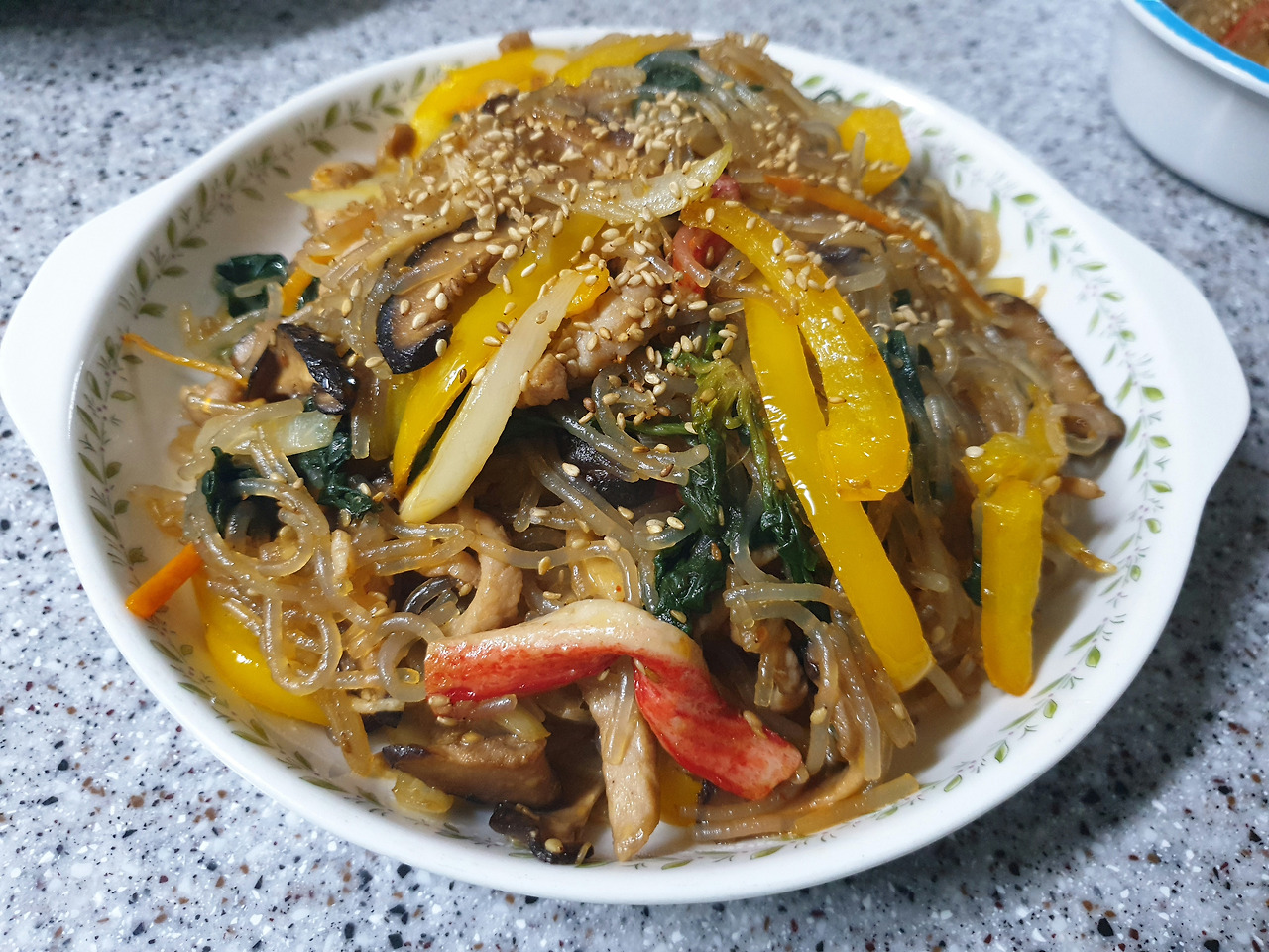 물기가 완전히 빠진 당면은 투명한 색에서 약간 흰색으로 변한다. 그리고 뭉툭하게 떡처럼 엉켜 붙는다. 이때가 바로 양념을 넣어야 할 순간이다. 간장, 설탕 참기름을 넣고 볶아준다. 충분히 색이 나오면 기존에 볼에 넣었던 재료들을 한대 섞어준다. 이제 완성이 된 것이다. 마지막에 뿌리는 깨소금은 좀 더 눈을 즐겁게 해주는 장식과 같다.
