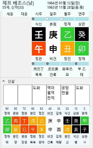 7-2)위에 열거한 다른 조건 빼더라도 신살 공망은 묘한 것이다. 밑독이 깨진 항아리처럼 뭔가 새어나가는 작용. 월지에 있으면 진로,직업,직장,부서 이동이 잦아지는 불안성이 생긴다. 불안성을 해소하고 안정과 번영을 확보할수 있는 방법으로는 첫째로 고향을 떠나 타지 생활하는 것(해외 무대 포함), 둘째로 중앙보다 변두리 무대에서 활동하는 것(오프라인보다 온라인 무대), 셋째로 유형의 재화보다 무형의 가치를 추구하는 것 등이 있다. 제프 베조스 같은 경우도 온라인 시장을 주무대로 하는 점, 애초에 컨텐츠 사업(도서)으로 시작했고, 지금도 컨텐츠 생산 유통 사업을 주류로 두고 있다는 점으로 공망을 잘 활용하는 모습이다.