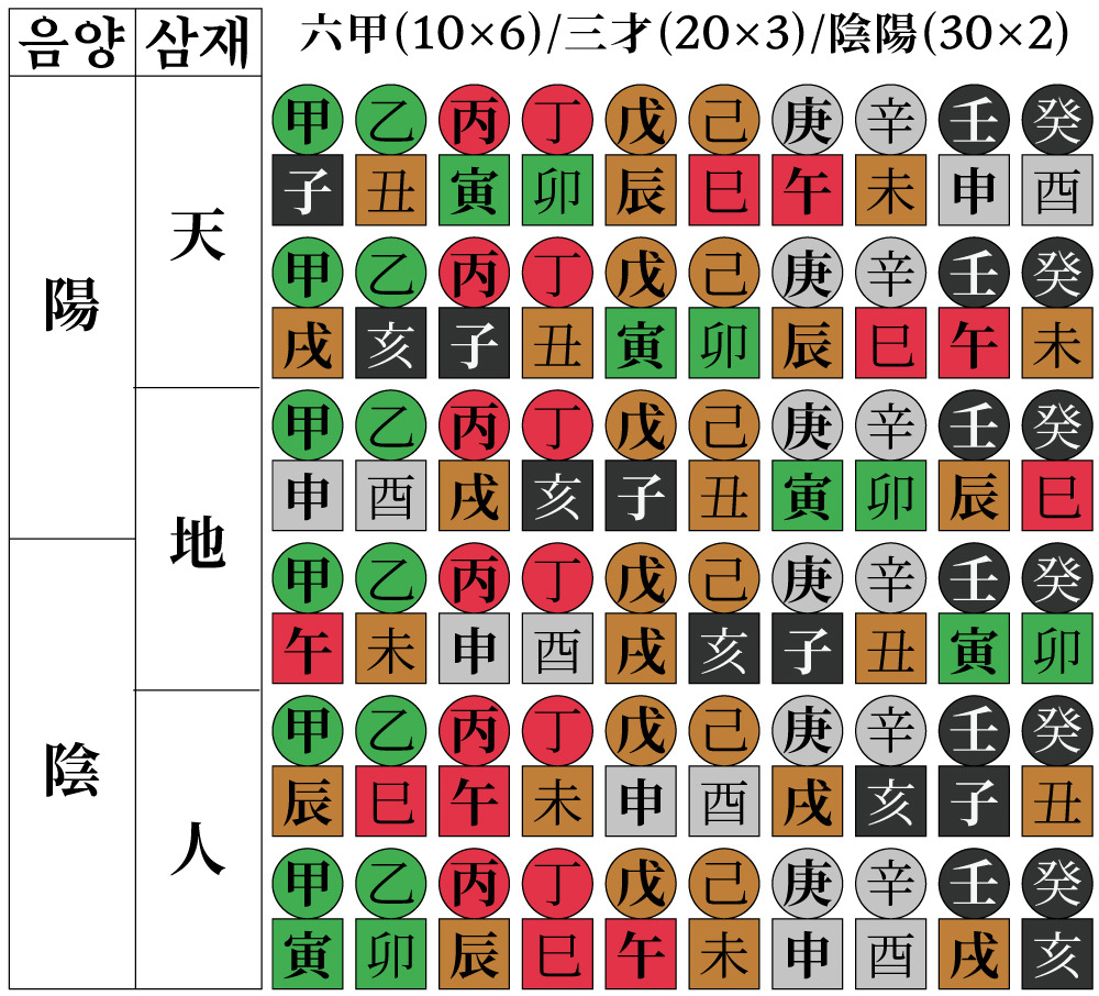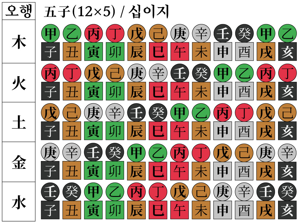 십이지(12)를 중심으로 60간지를 분류하기에 자연스럽게 오행(12×5)의 결이 함께 형성된다. 5층으로 이뤄진 60간지 분류의 각 층에 좌우 양끝에 같은 오행으로 배정되어 해당 층을 특정 오행의 시작과 끝으로 물들이는 것이다. 좌측에는 자축(子丑)이 오행의 시작을 드러내고, 우측에는 술해(戌亥)가 오행의 끝을 드러낸다. 정신적인 저장을 뜻하는 수(水)와 현실적인 저장을 뜻하는 토(土)가 함께 어우러져 정보를 주고 받으며 60간지의 오행을 시작하고 마무리하는 것이다.