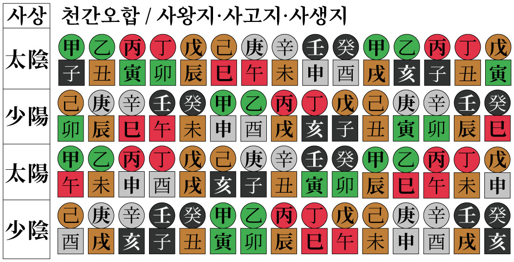 4층의 수직을 비교해보면 천간은 각각 '오합(五合)'을 이루고, 지지는 각각 '왕지(旺支)/고지(庫支)/생지(生支)'로 분류된다는 사실을 발견할 수 있다.