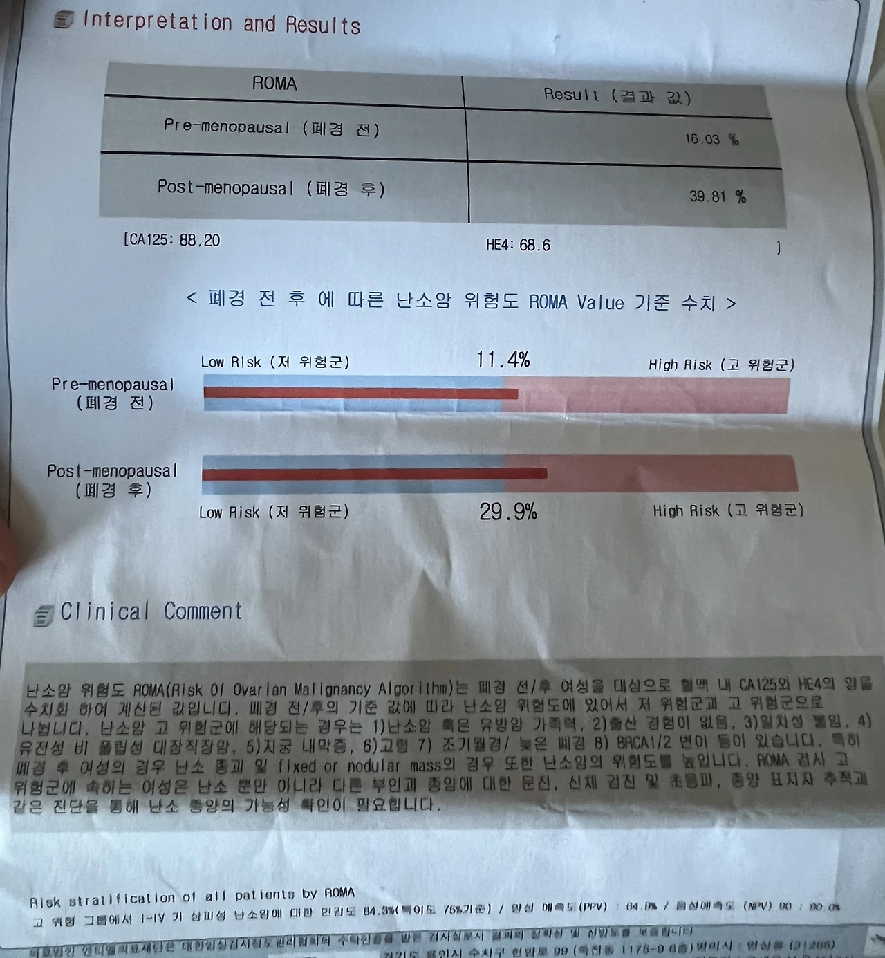 난소암 위험도를 측정하는 ROMA는 폐경 전, 폐정 후 둘 다 고 위험군이 나왔고, 저는 아이를 출산한 적이 없고 비만이기 때문에 고 위험군에 해당했습니다. 이 외에도, 노화, 난소암이 있는 가까운 친척, 월경을 일찍 시작하거나 폐경이 늦게 오거나 하는 경우에도 고 위험군에 속한다고 합니다.