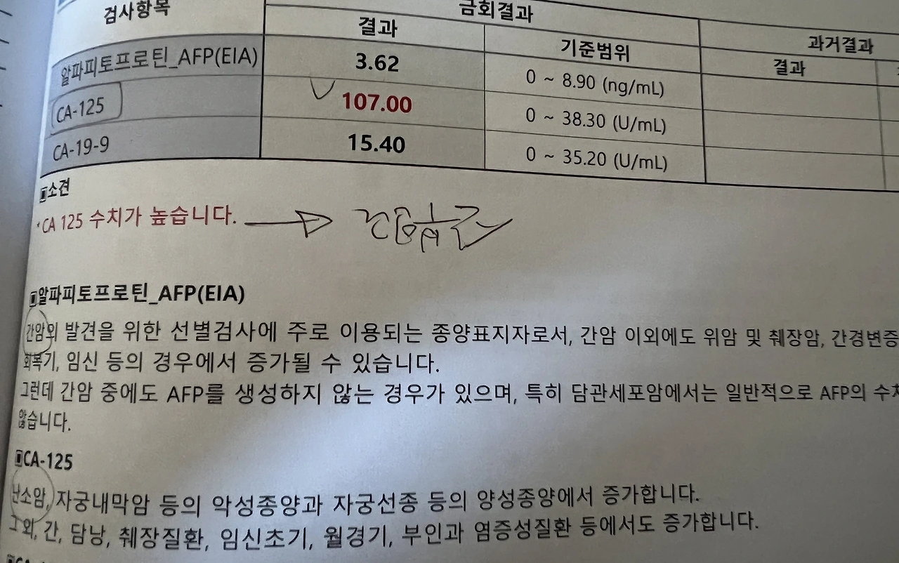4년만에 한국에 와서, 정기 건강 검진을 받으러 갔는데요, 채혈검사 결과 중에서 CA125라는 수치가 기준치인 0-38.3 (U/mL)의 거의 세 배가 되는 107.00이 나왔습니다. 하지만, CA125는 호르몬이나 생리주기에 따라 높아질 수 있고, 자궁내막이 두꺼운 경우에도 높게 나올 수 있으니 정밀검사가 필요하다는 말을 들었습니다. 또, 이때 간수치와 갑상선 수치, 그리고 고지혈증이 있다고 해서, 우루사를 비롯한 약을 한 보따리 받아 들고, 동네에 좀 더 큰 병원에 가서 다시 정밀 검사를 받았습니다.
