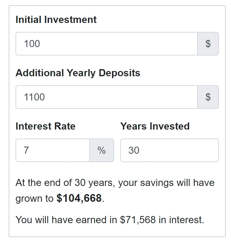이렇게 내가 $100씩 모은 돈은 30년 후에 $104,668이 됩니다. 지금 $100로 내가 노후에 쓸 $100,000을 준비할 수 있다는 얘기죠.