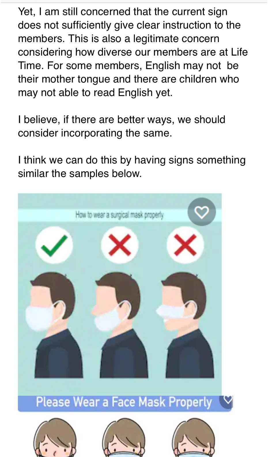 요약하자면, 우리 Gym에는 다양한 인종의 사람들이 다니고, 그중에는 영어가 모국어가 아닌 회원들도 있고, 글을 읽지 못하는 아이들도 있다. 단지 마스크 그림 하나 떠~억 그려놓고, 그 아래 블라 블라 쓴 공지는 충분하지 않다. 만일, 이를 개선할 방법이 있다면, 바꿔야 하지 않겠느냐며 예시와 함께 이메일을 보냈다.