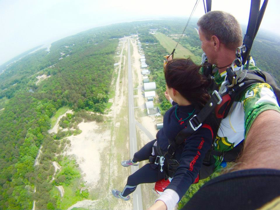 비행사가 준비 완료 사인을 주자 강사와 나는 비행기에 올라탔다. 날씨가 좋아 공중으로 올라가는 비행기 안에서 불섬 해변 전체가 한눈에 들어왔다. 비행기 안에서 강사와 내 몸을 이어주는 안전장치를 다시 한번 확인했다. 투명 안경도 끼고.... 9500 feet 고도에 도착하자 강사가 비행기 문을 열였다. 공기 압력이 대단했다.