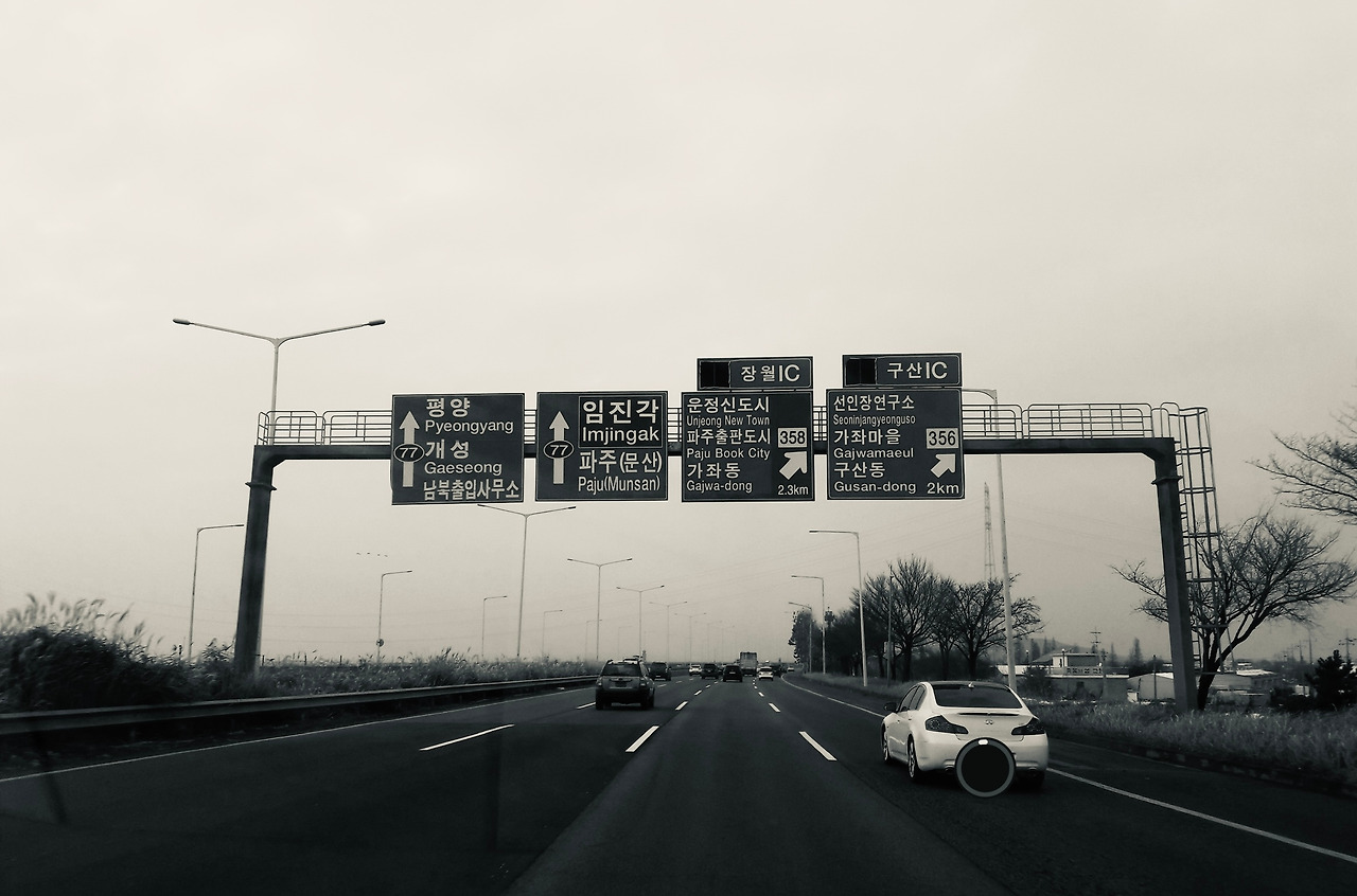 파주를 오는 가장 빠른 길은 자유로다. 자유로를 타고 갈 수 있는 곳의 끝은 임진각, 거기에서 몇 가지의 절차만 더 거치면 조금 더 올라가 도라산까지 갈 수 있다. 또 거기에서 몇 가지의 절차를 더하면 민통선 안의 마을에도 들어갈 수 있다. 그래봐야 거기가 끝이다. 하지만 도로표지판에서는 평양도 가고 개성도 갈 것처럼 직진 방향 표시가 선명하다.