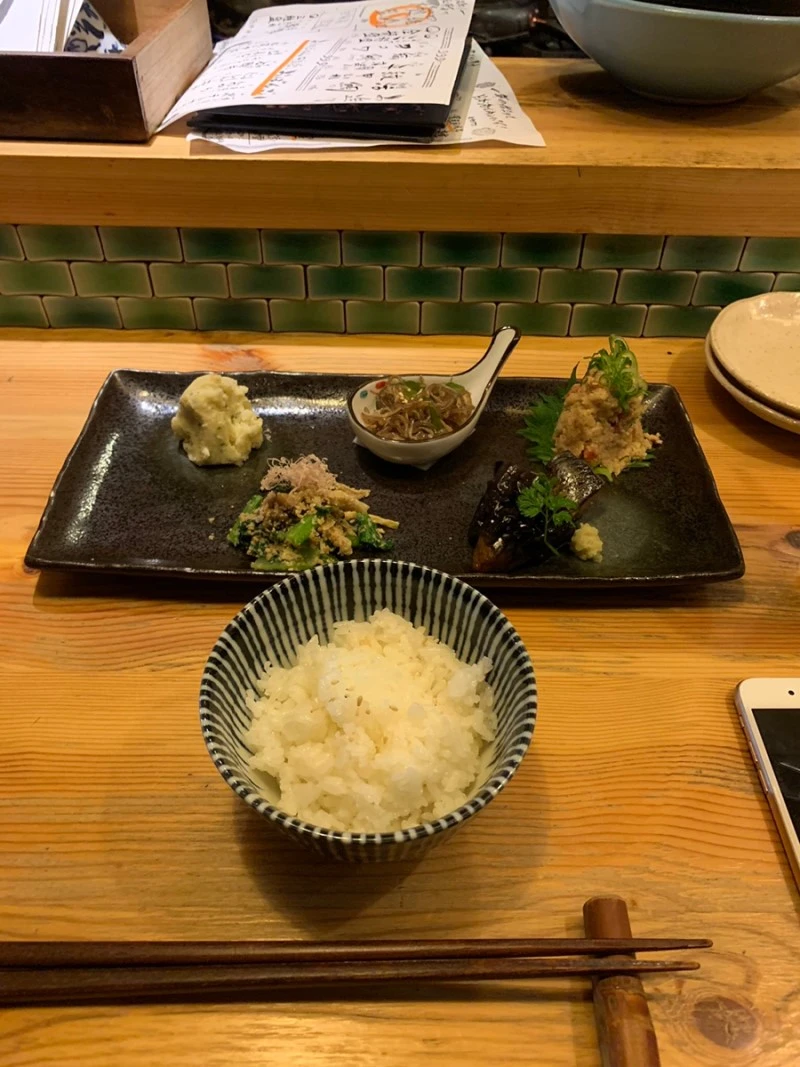 오반자이[おばんざい], 교토의 가정식 반찬을 말하지요. 오반자이를 즐기며 가벼운 술을 마시며 퇴근 후의 피로를 푸는 단골손님들이 많은 곳이었습니다. 이곳이 처음인 나는 구석자리를 안내받았습니다. 커다란 그릇에 담긴 카운터 앞에 있는 반찬들을 주인아저씨가 상세히 설명해주었습니다. 그리고 좋아하는 것을 단품으로 골라도 되고, 각자 조금씩 담아 한 접시를 만들어도 된다고 했지요. 그리고 나머지 메뉴는 혼자 먹기 적당하게 양을 반으로 조절해 주시겠다 했습니다. 혼자인 사람에게는 참 고마운 배려지요.