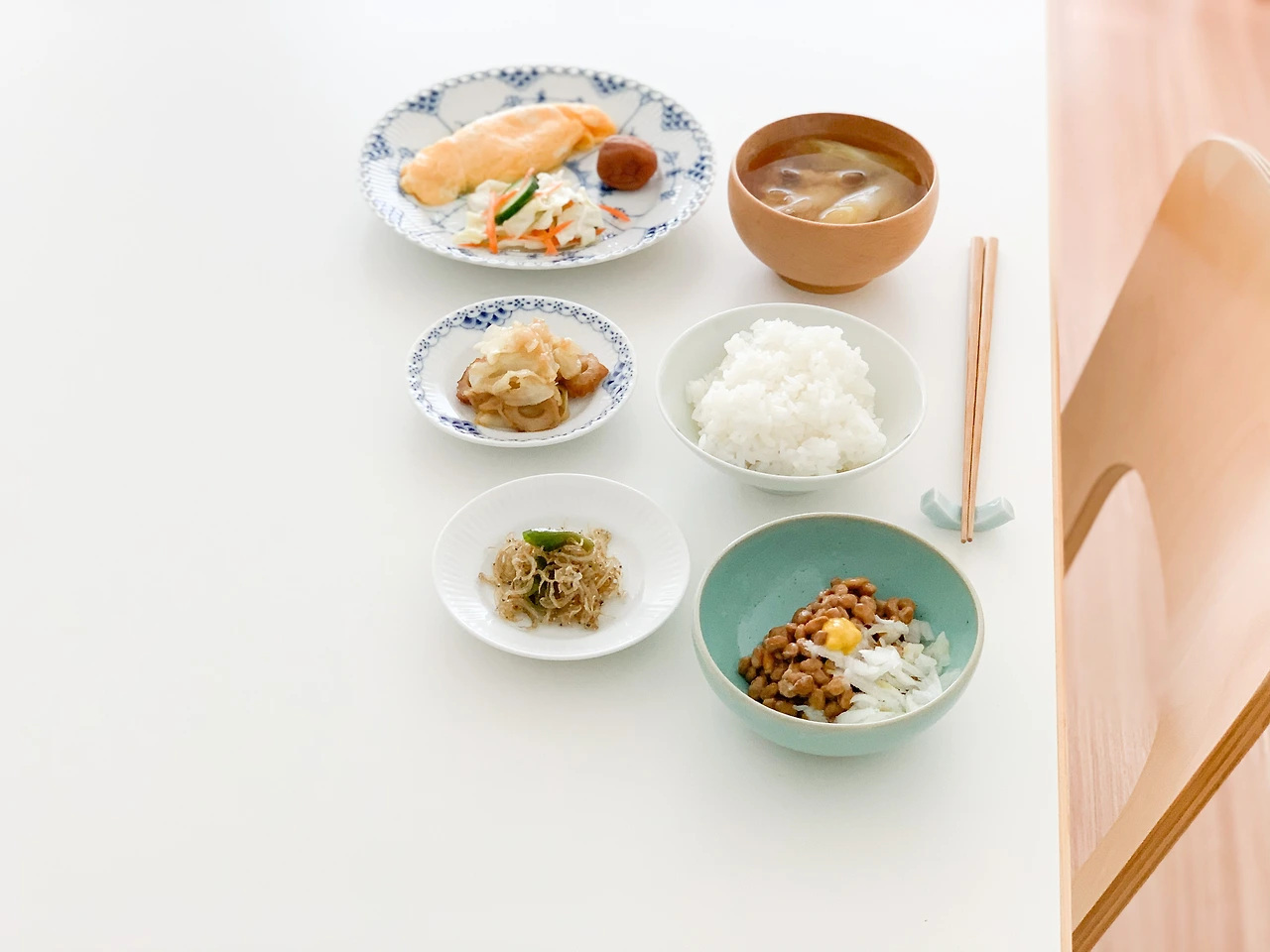 아침상에는 미소시루와 낫또까지 더했더니