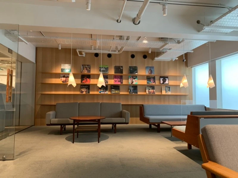 책과 레코드판이 양 벽면에 꽉 차 있는 풍경이