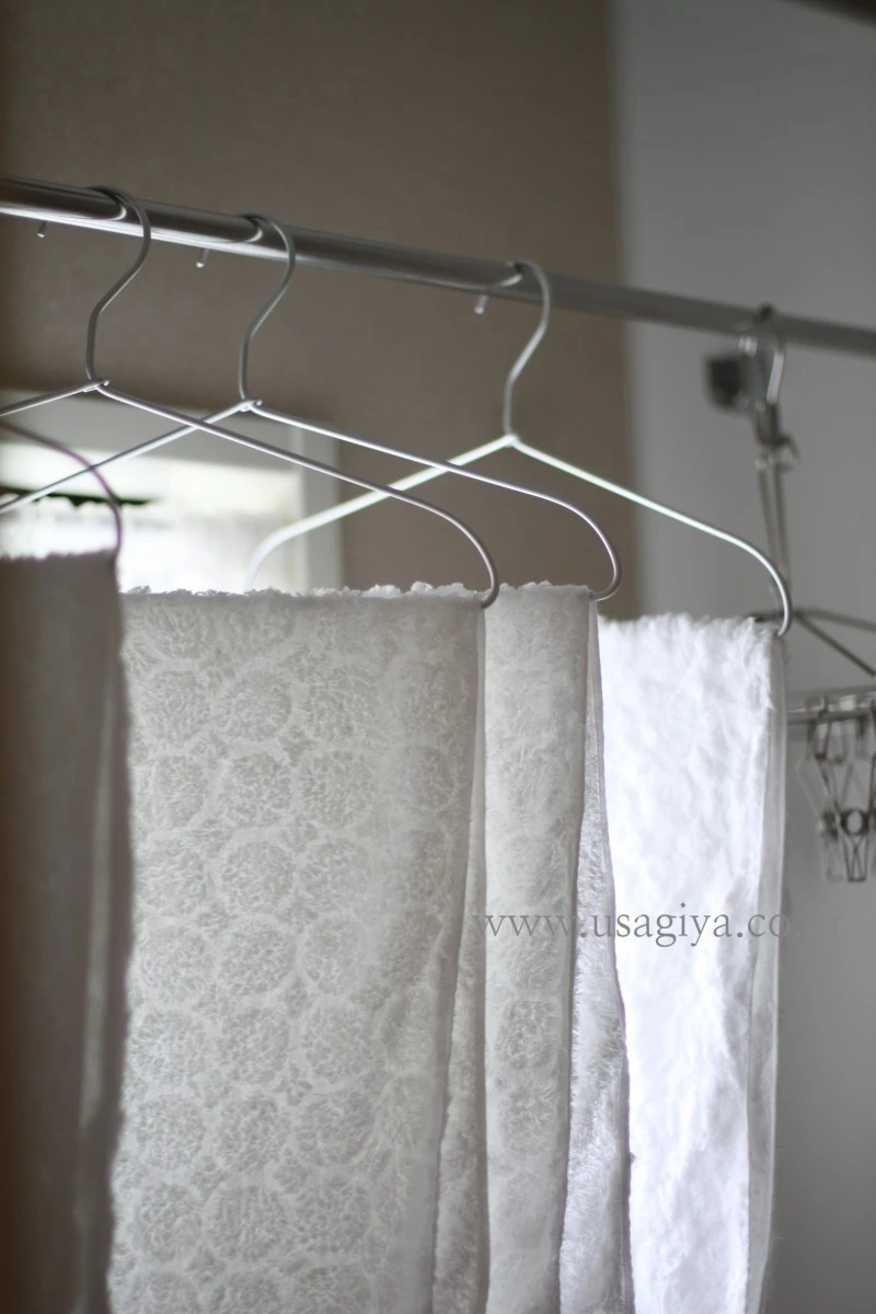 세탁기 앞 쪽으로 하얀 커튼을 달았다.