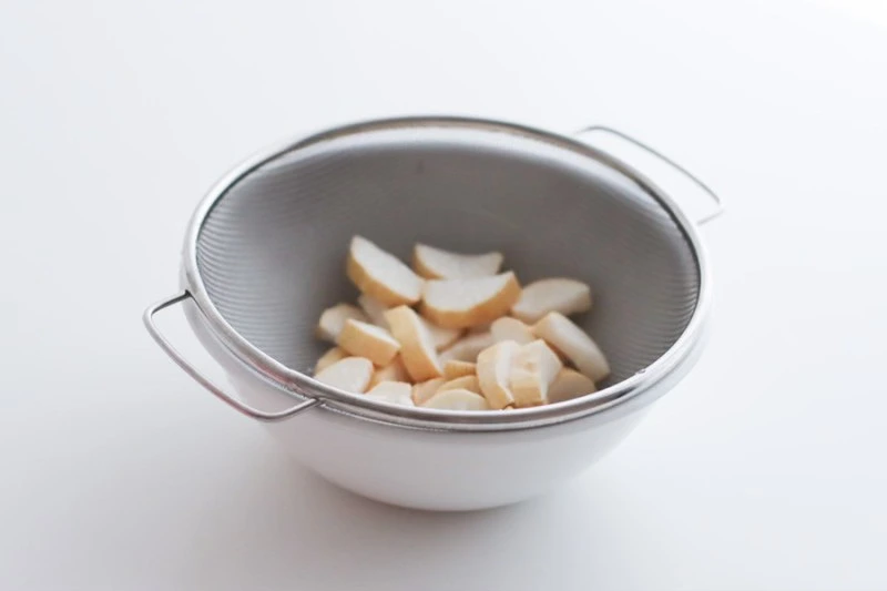 말린 무는 반으로 잘라 식감이 잘 느껴지도록 조금 도톰하게 썰었다. 다음은 따뜻한 물을 부어 깨끗이 씻은 후 물기를 빼주고.