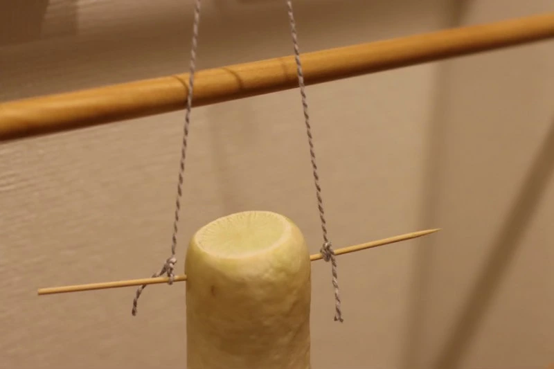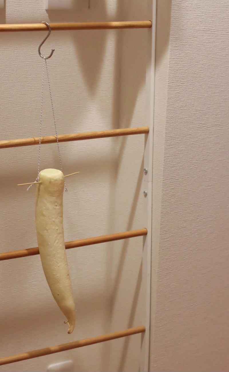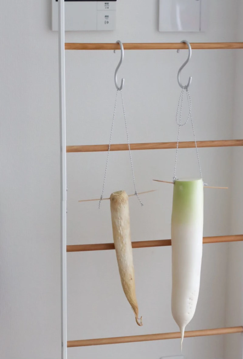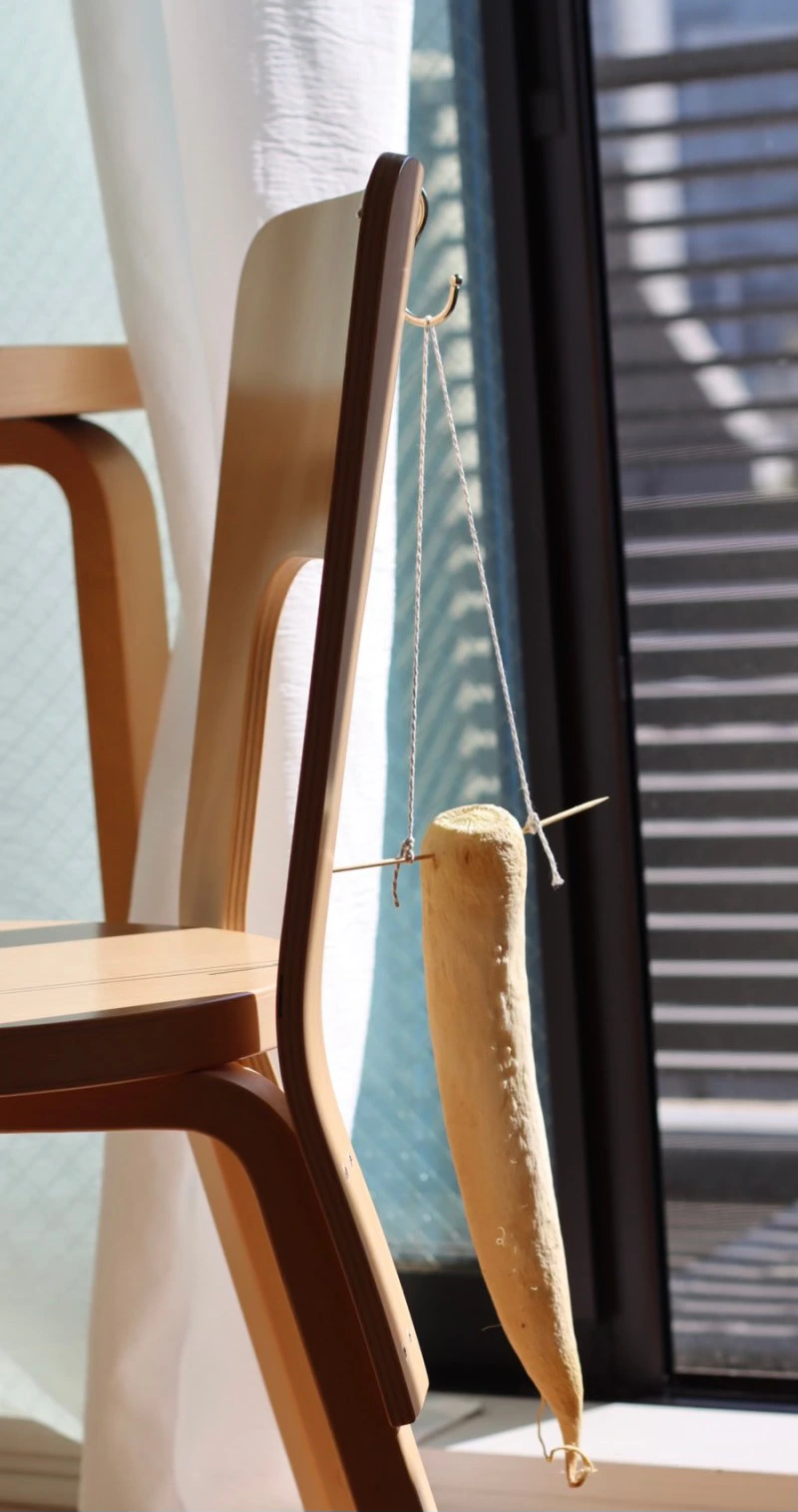 늘 이맘때가 되어 문뜩 그 가게 앞의 무를 마주하면 나도 한번 말려봐야지 하고 생각만 했었는데.. 생각만 한 게 몇 년 만인지 드디어 내게도 무를 말리는 날이 왔다. 그 가게의 무를 따라 무 윗부분에 꼬치를 끼우고 그 양쪽에 실을 끼워 사다리 행거에 걸어 두었다. 원래는 찬 바람에 말려야 제맛이겠지만 일단 테스트로 실내에, 마음은 무 서너 개는 말려주고 싶었지만 혼자 먹기엔 하나면 충분하고 일단 테스트니까 욕심내지 않기로 했다. 근데 거실 한 편에 무 하나만 걸어놓은 모습이 뭔가 허하면서도 새초롬 귀엽기도 한 게 며칠 오며 가며 관찰하는 재미가 쏠쏠하다. 작은 화분을 하나 놓아두고 꽃이 피는 걸 기다리는 마음이랄까..