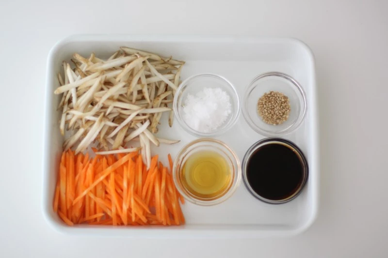 재료 : [1인분] 우엉 50g, 당근 25g, 참기름 1/2작은술, 식초 조금, 깨 조금
