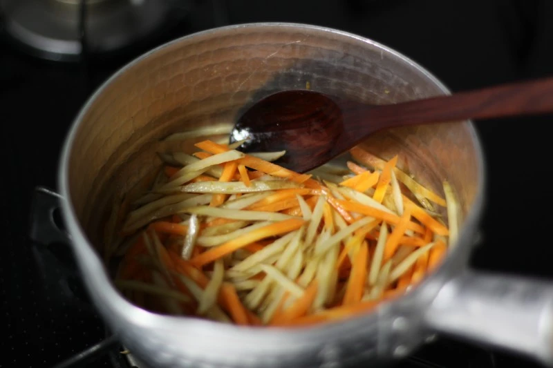 우엉, 당근, 연근 등을 기름에 살짝 볶은 다음