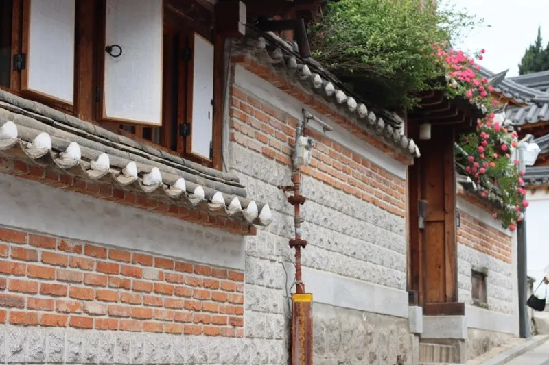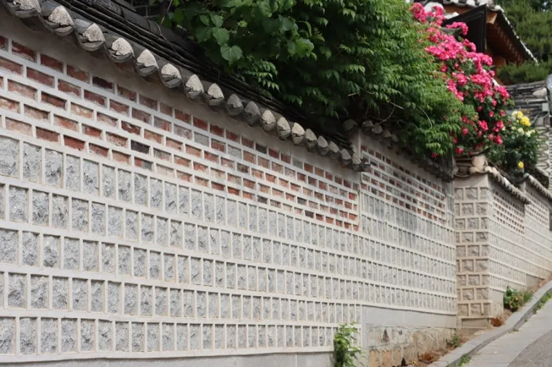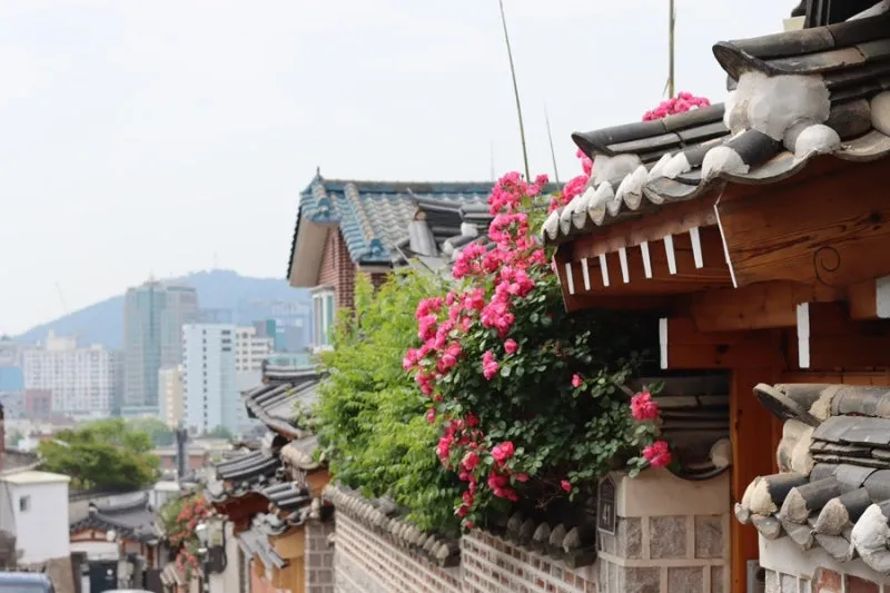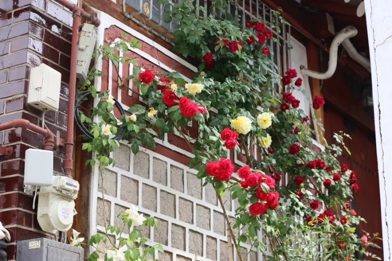 기와지붕 사이에 파묻힌 풍성한 장미 아래로
