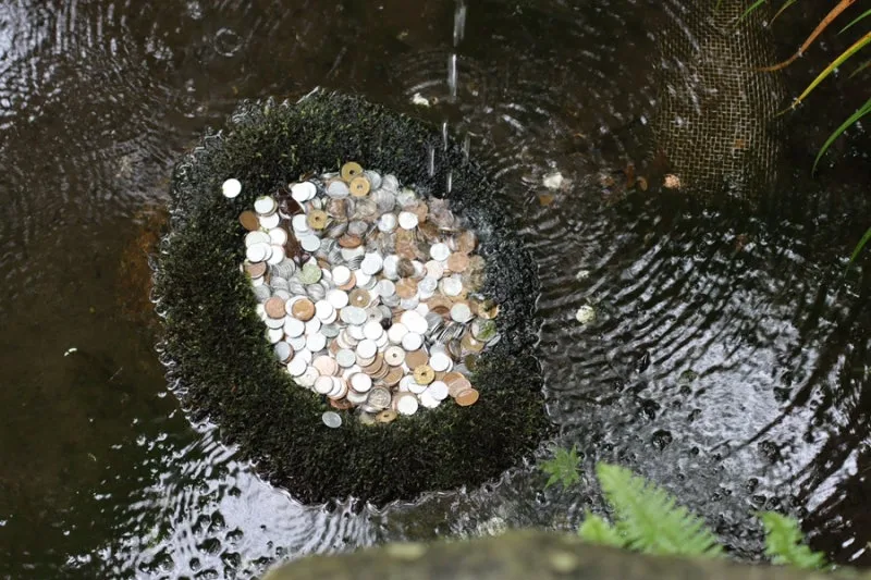흐른 물이 고인 곳에 가득 찬 동전들.