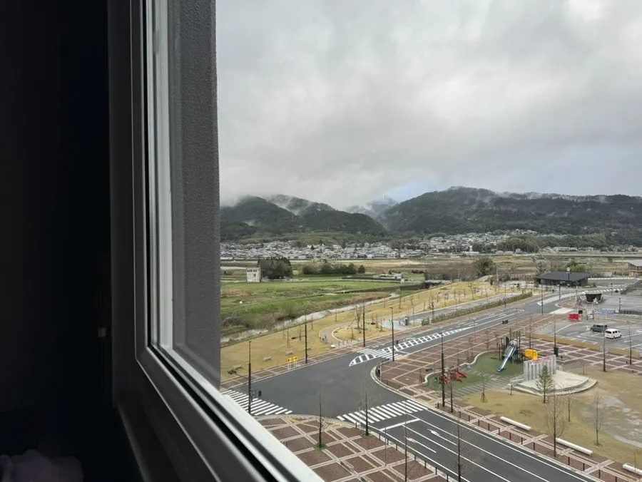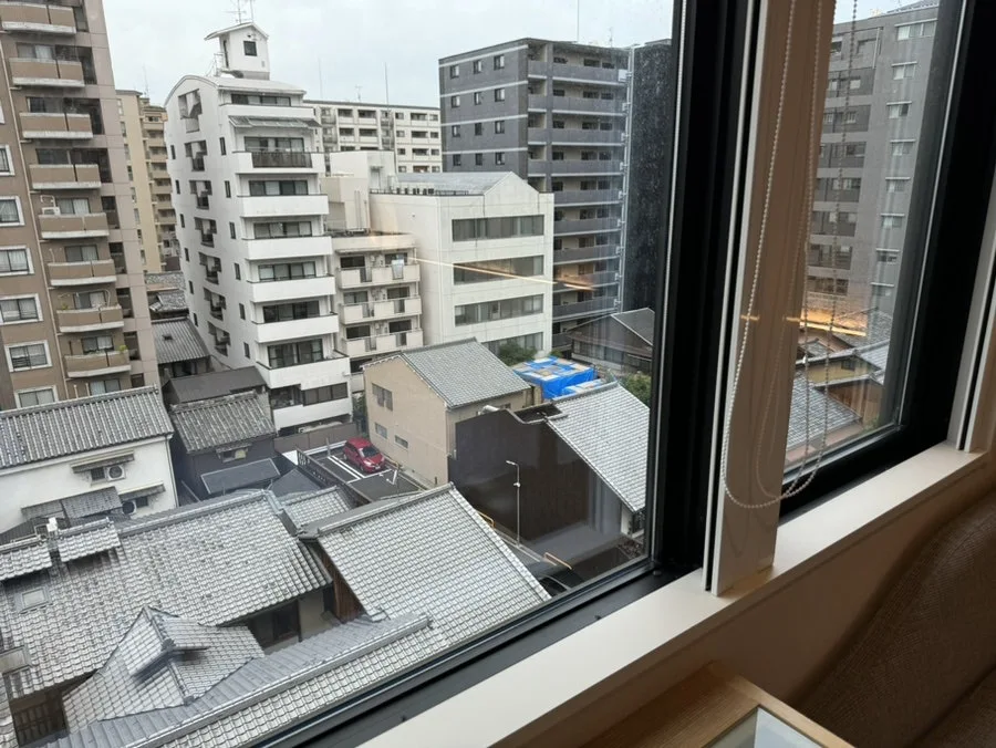 창 너머로 펼쳐진 카모가와 너머 풍경은