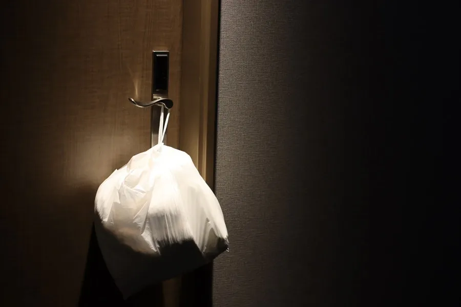 타월을 넣은 비닐봉지를 룸 손잡이에 걸어둔다.