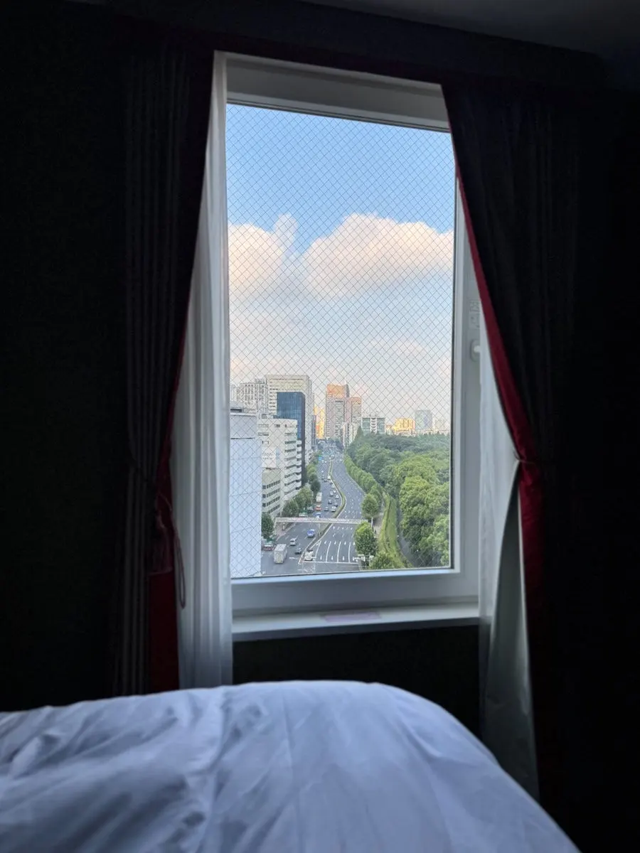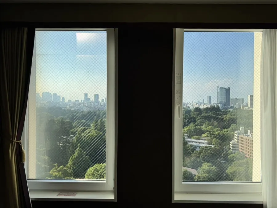 동생과 조카는 트윈 베드로 저는 싱글로 예약해서 층이 다를 거라 예상했는데 감사히도 같은 층으로 배려해 주었어요. 트윈 베드 룸은 고층 예약으로 어느 정도 기대는 있었지만, 한눈에 들어오는 뷰를 보는 순간 저도 모르게 감탄사가 세어 나왔어요. 창밖으로 보이는 웅장한 나무들, 그 안쪽으로 영빈관 아카사카 이궁이 있고, 그 너머로 신주쿠의 빌딩 숲이 보여요. 침대에 누우면 한눈에 들어오면 풍경이 정말 멋졌어요. 밤이 되면 뒤덮인 어둠 너머로 빌딩 숲들이 별을 뿌려 놓은 것처럼 반짝였구요. (아, 물론 동생 침대에 살짝 누워 본거지만요)