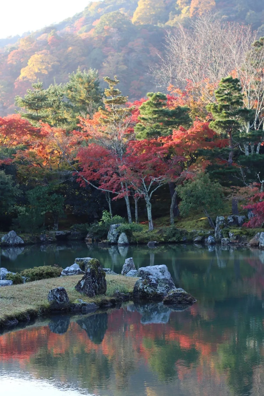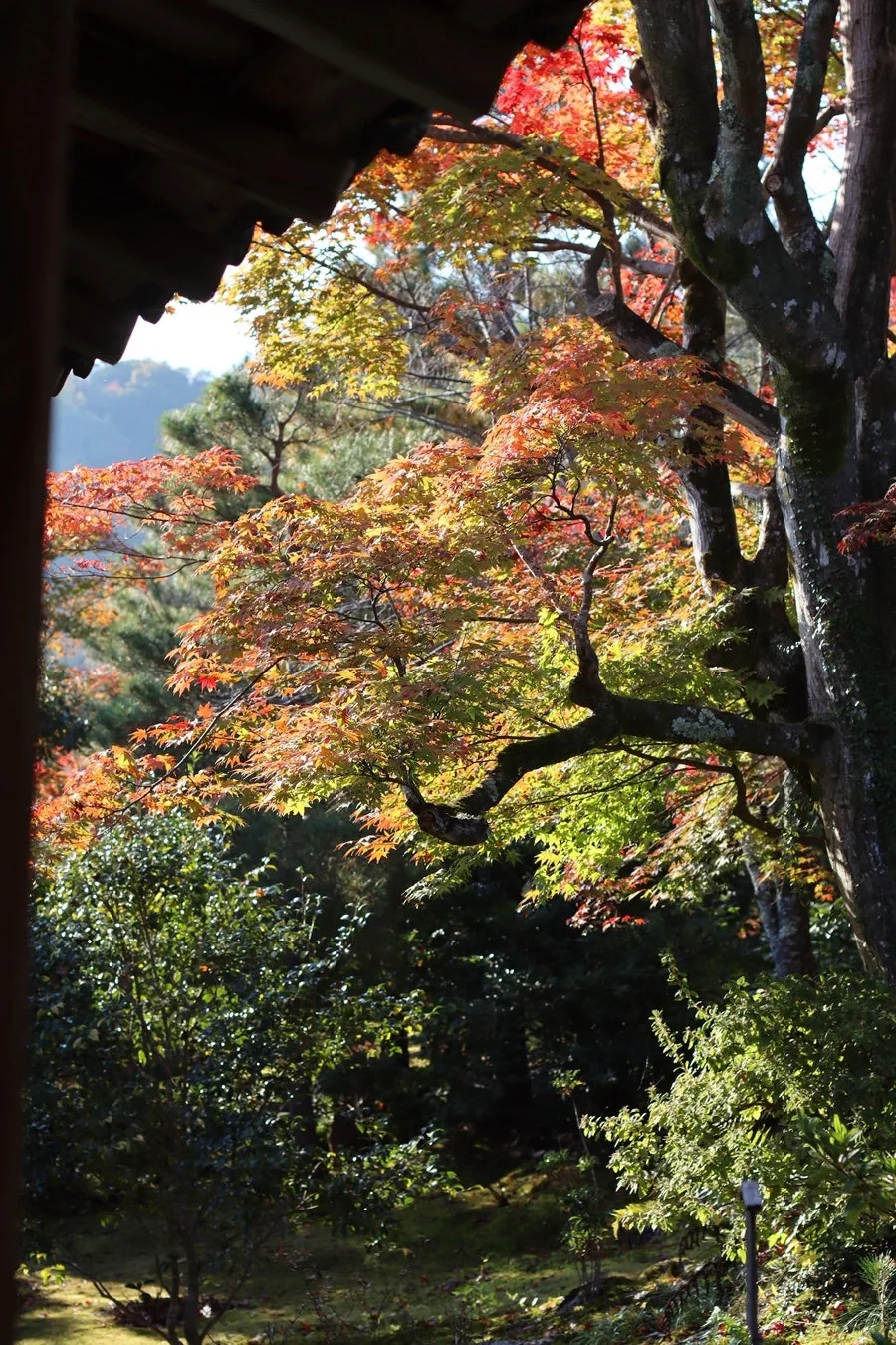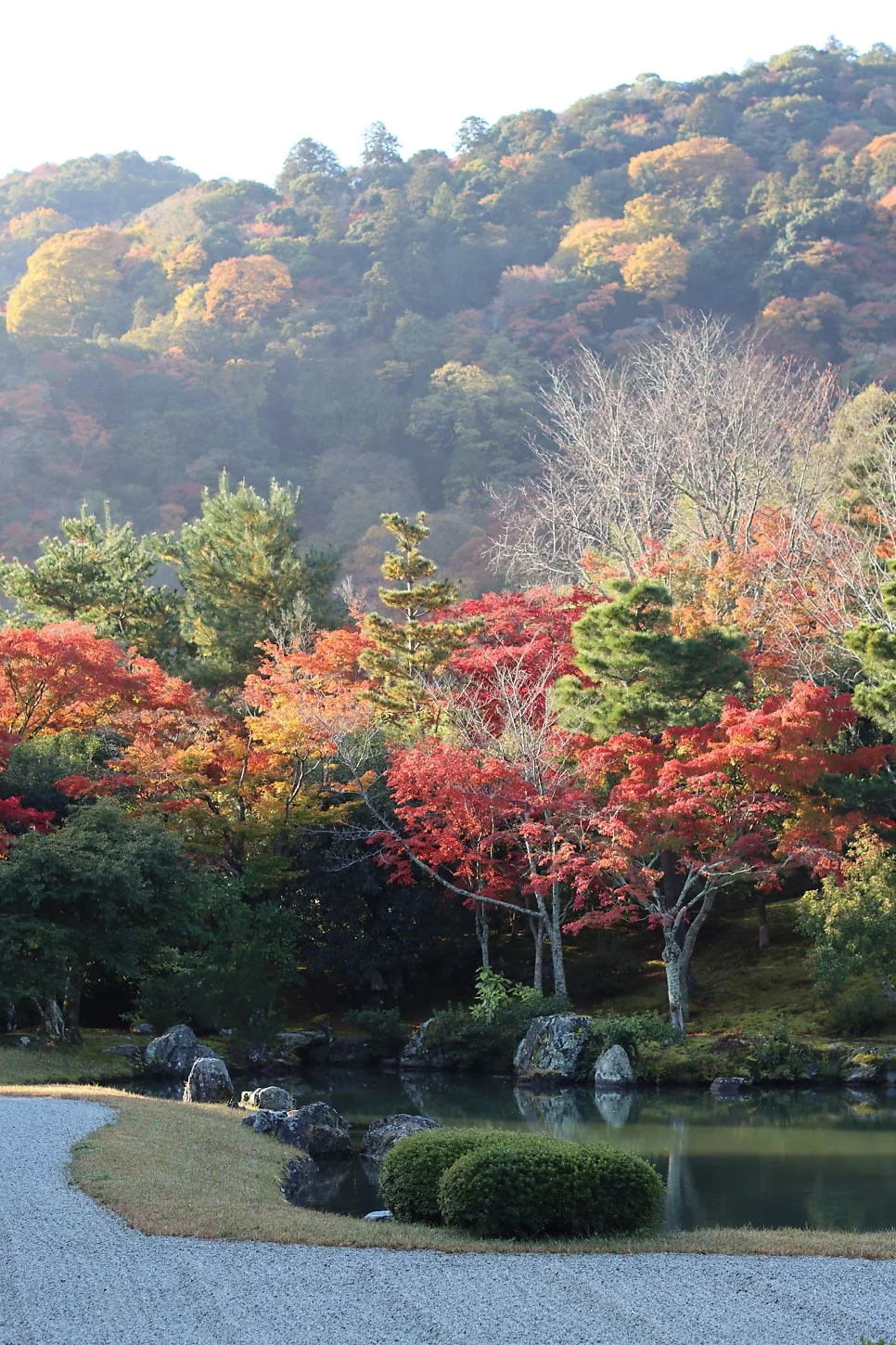 교토의 단풍 시즌을 찾아보면 11월 중순에서 12월 초순으로 나온다. 예전엔 무심히 단풍의 절정이라 하면 온 세상이 울긋불긋 가을 색을 입은 걸 상상했는데 텐류지의 정원을 걸으며 유심히 들여다보니 그렇지 않았다. 이미 겨울 색을 입은 앙상한 가지만 남은 나무, 아직 가을 색이 옅은 나무, 한참 절정으로 빛나는 나무, 그 모든 나무들이 뒤섞여 계절의 경계선이 모호해진 풍경이 바로 절정이고 그게 가을인 것이다.
