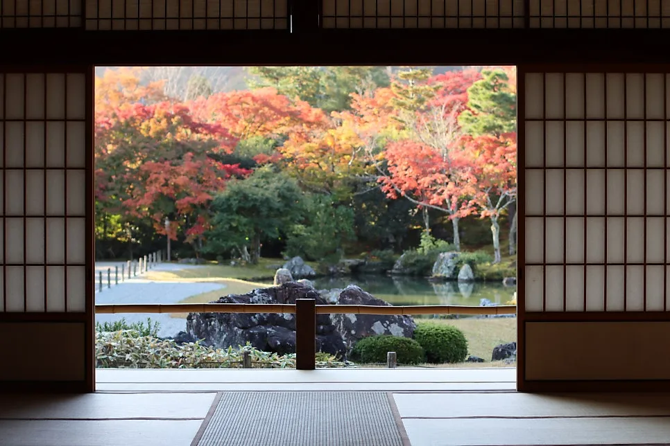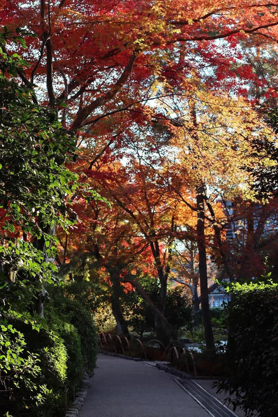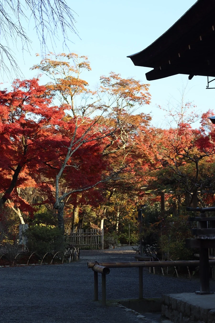 교토의 단풍 시즌을 찾아보면 11월 중순에서 12월 초순으로 나온다. 예전엔 무심히 단풍의 절정이라 하면 온 세상이 울긋불긋 가을 색을 입은 걸 상상했는데 텐류지의 정원을 걸으며 유심히 들여다보니 그렇지 않았다. 이미 겨울 색을 입은 앙상한 가지만 남은 나무, 아직 가을 색이 옅은 나무, 한참 절정으로 빛나는 나무, 그 모든 나무들이 뒤섞여 계절의 경계선이 모호해진 풍경이 바로 절정이고 그게 가을인 것이다.