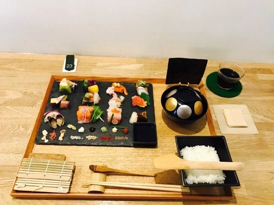 이곳이 바로 테오리즈시[手織寿司]를 즐길 수 있는 아우-무 [アウームAWOMB]입니다. 누구든 보는 순간 알록달록 고운 색감에 식재료의 절묘한 조화에 말이 필요 없는 그 앙증맞음에 한눈에 반하지 않을 수 없는 테오리스시랍니다. 오루[織る:여러가지를 짜 맞춰 만들다]라는 말을 콘셉트로 교토의 식재료를 중심으로 준비한 알록달록한 재료들을 (손님들) 기호에 맞게 잘 조화시켜 먹으라는 뜻의 테오리스시[手織り寿し]에요. 즉 테마끼스시[手巻き寿司:손으로 말아먹는 김말이 초밥]를 말하지요.*테[手:손]